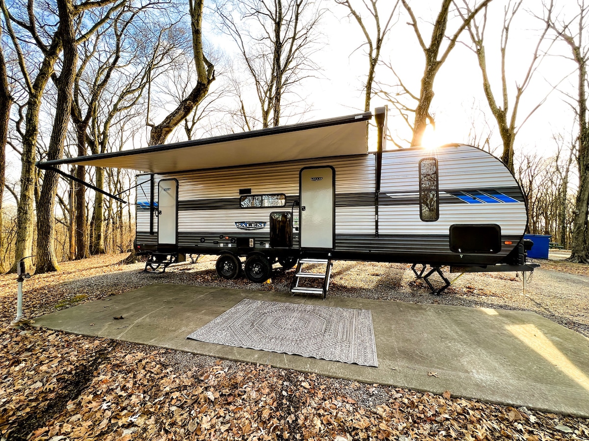 Kemm tidher u tieħu gost bil-kampeġġ kollu mingħajr ma tħejji ruħek fir-RV il-ġdida tagħna. 5-10 minuti minn I 57/70 u Effingham, Mijiet ta' ristoranti, fabbriki tal-inbid, mogħdijiet għar-roti. Keystone Passport Grand Touring 27' Kamper ġdida sabiħa għal 4 staġuni li tgħix bi kċina fuq barra, grill, tined awtomatiċi, kamra tal-banju b' banju/doċċa, kċina b' disinn miftuħ, bunks doppji, kamra tas-sodda ewlenija queen fuq barra fuq 10 ettari ta' boskijiet u mogħdijiet f' belt żgħira paċifika. Estremament nadif. Firepit bis-siġġijiet.