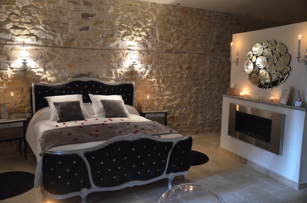 Qed tfittex vaganza romantika romantika? Ħejji ruħek għal lejl mill-isbaħ fis-suite "So Chic So Romantic" tagħna ta' 30 m2. Is-sodda b' erba' posters, id-doċċa mixgħula, il-mirja l-kbar u s-sufan tantra jistiednuk tirrilassa u tirrikonċilja. Fuq it-terrazzin mgħotti, gawdi l-hot tub f' temperatura ta' 38°C. Is-suite mgħammra b' kollox (kċina miftuħa, TV, wifi, parkeġġ privat, daħla indipendenti) Il-kolazzjon huwa b 'xejn. Ikkuntattjana biex tippersonalizza ż-żjara tiegħek.