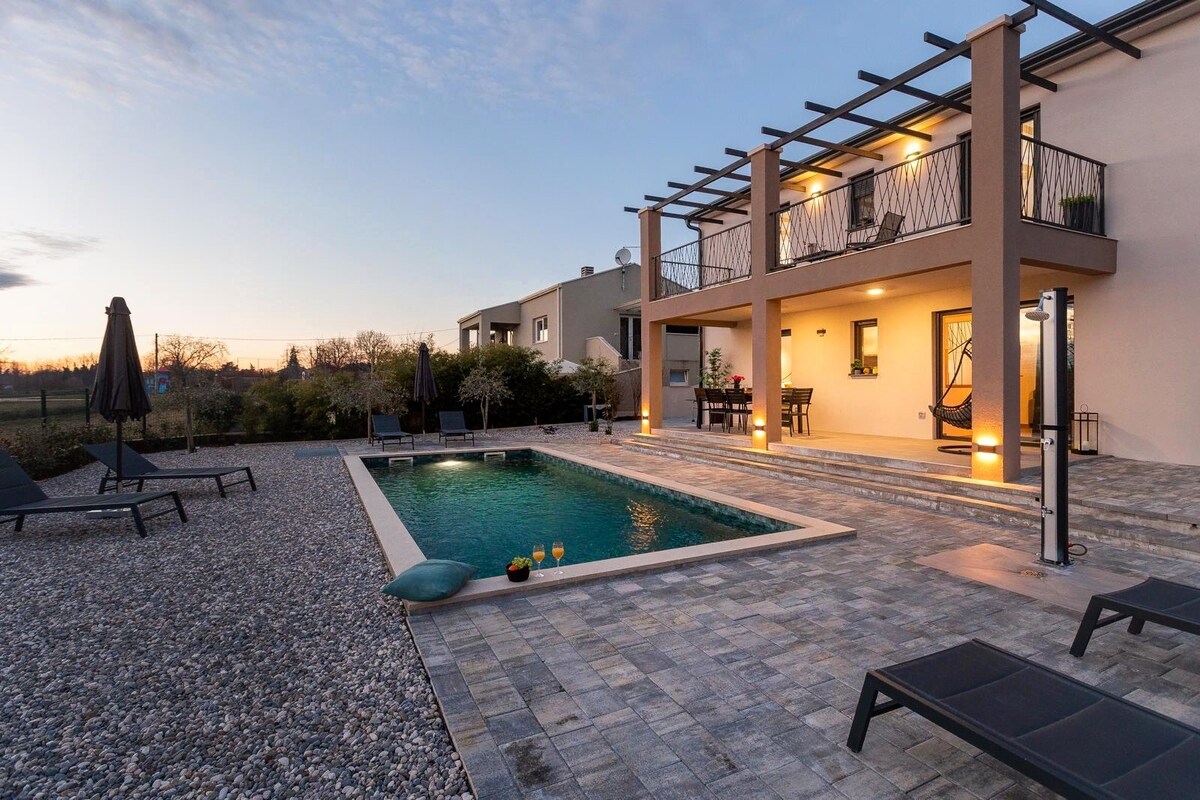 Villa stilizzata qrib Rovinj b'pixxina li tistax titlifha, hot tub li jidħol fil-baħar u sawna. Qum filgħodu u sib veduti panoramiċi ta' widien mimlija ħaxix. Post addattat għall-koppji u l-familji, ftit minuti bil-karozza 'l bogħod minn park tal-avventura, il-Park Nazzjonali ta' Brijuni, dinopark, bliet medjevali u ikel lokali. Hija verament ħarba ekoloġika għal kull min ifittex li jerġa' lura għan-natura bil-kumdità kollha tal-għajxien modern. Mgħammra b' kollox għat-tisjir u d-divertiment f' 2600 m2 ta' ġnien (futbol, ballun tal-veloċità, badminton u divertiment fil-pixxina) biex it-tfal u l-għeżież tiegħek igawduhom.