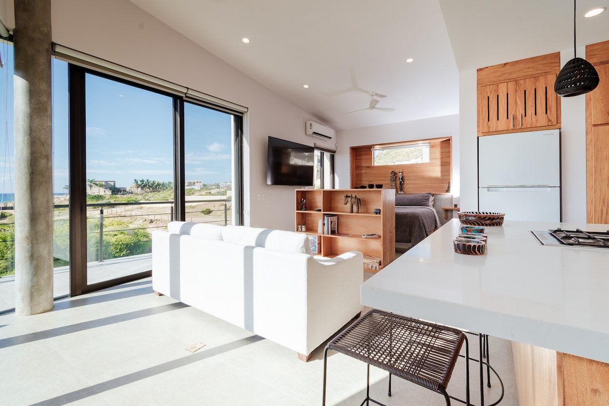 Veduti epiċi minn kull direzzjoni! Inti se tkun minfuħ mis-sbuħija ta 'Baja California Sur minn dan l-appartament ġdid, eleganti u kompletament maħtur. Gawdi l-kafè fuq il-gverta filwaqt li tara t-tlugħ tax-xemx fuq il-muntanji. Wara s-surfing u l-għawm tal-ġurnata tiegħek fuq il-bajja ta 'Cerritos (ftit minuti biss' il bogħod bil-mixi jew bil-karozza) irrilassa fil-hot tub waqt li x-xemx tkun qed tpoġġi fuq il-Paċifiku. B' veduti mingħajr xkiel minn kull angolu inti garantit li tara l-balieni jiksru matul l-istaġun. Iktar privatezza mill-condos