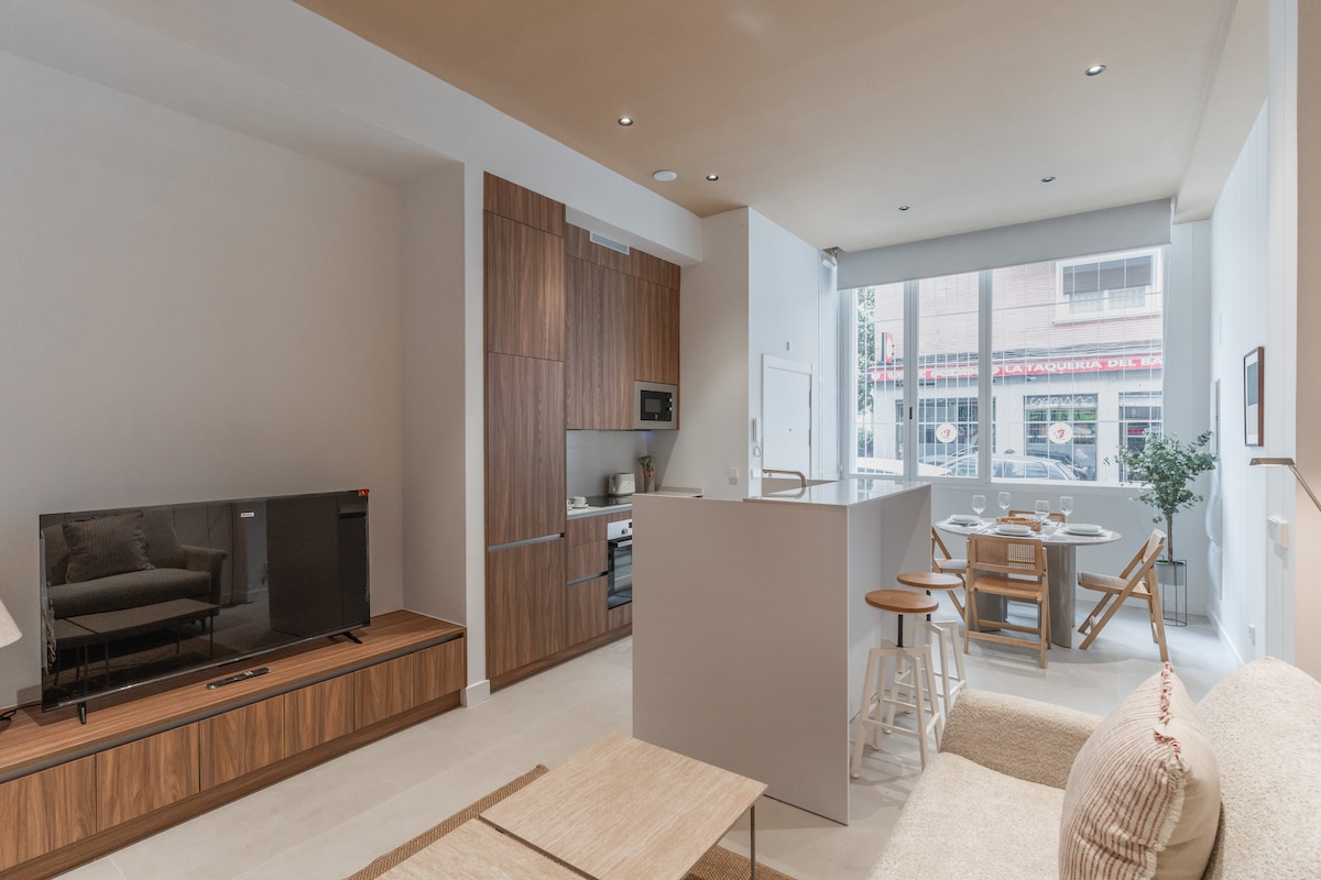NON-TOURIST ACCOMMODATION, ideal for stays related to work, study-training, medical reasons, family visits or personal needs. Modern, cozy and bright apartment with independent access and high-quality finishes. It features 1 bedroom, a full bathroom and a living-dining area with a fully equipped open-plan kitchen. Located in Chamartín, next to Cuatro Torres, La Paz Hospital and Chamartín Station. Safe, quiet and well-connected area with metro, bus, train and local services just minutes away