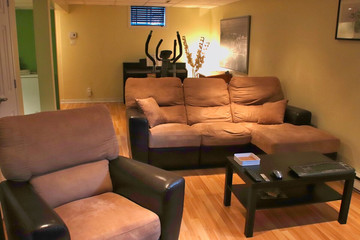 Qiegħed f 'żona residenzjali sabiħa kwieta u sigura fil-qalba tal-laval. L-akkomodazzjoni bil-possibbiltà ta '2 ikmamar tas-sodda tinsab fil-kantina tad-dar. Huwa mixgħul ħafna b 'daħla privata, mgħammra tajjeb ħafna u nadif ħafna. Perfetta għal familja kwieta. 5 minuti minn Place Bell, Centre Laval 3 minuti mill-istazzjon tal-metro ta 'Cartier u ċ-ċinema Guzzo Qrib diversi ristoranti (TIM HORTONS, MCDONALD, SUBWAY, PIZZERIJA, DOMINOS PIZZA), ħwienet tal-grocer, spiżeriji. Il-parkeġġ mhux inkluż.
