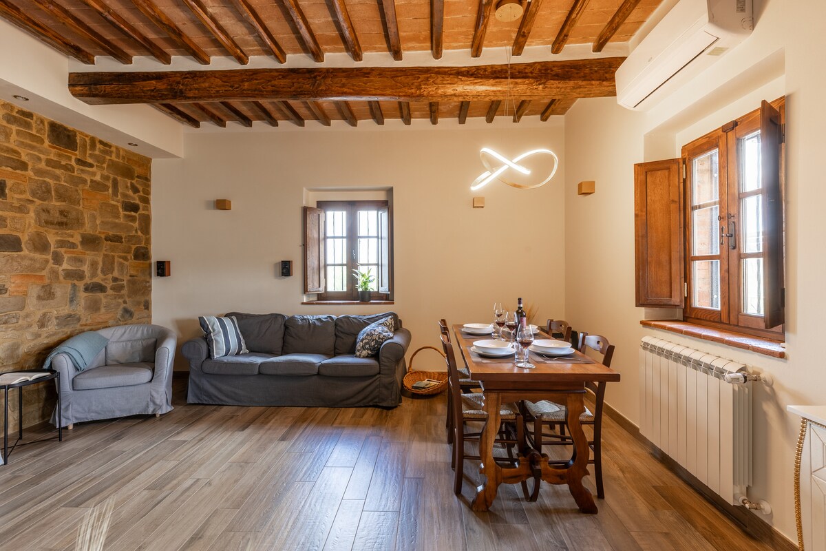 Id-dar tgawdi veduta rari u enchanting tal-Val d 'Orcia u Monte Amiata, li jiżguraw privatezza massima. L-interjuri jirriflettu l-faxxinu tal-istil Toskan, b 'għamara antika u finituri magħmula minn artiġjani lokali. Huwa mgħammar b 'kamra tas-sodda doppja, salott kbir b' mejda kbira, kċina mgħammra kollha, sodda tas-sufan doppju quddiem il-fuklar, fis-salott. Barra, il-patio jippermettilek li jieklu bil-kuluri ta 'l-sunset bħala sfond.