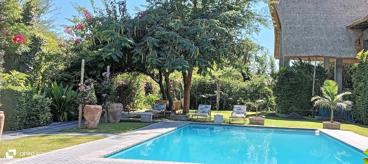 L-ikbar kmamar ġewwa Chobe (80m2). Kamra bi stil ta' appartament b' 2 ikmamar tas-sodda spazjużi, waħda b' sodda ta' daqs king importata u l-oħra b' żewġ sodod singoli b' tul żejjed, it-tnejn b' a/c. Issepara s-salott kbir b' sufanijiet komdi, mejda tal-ikel u TV. Toilets separati. Terrazzin b' mejda tal-ikel fuq barra. Ġonna kwieti, pixxina fuq barra u ristorant b' liċenzja sħiħa. 15-il minuta sal-ajruport ta' Kasane u 10 km sal-Park Nazzjonali ta' Chobe. Safaris ta' kuljum, kruċieri tad-dgħajjes u Vic Falls.