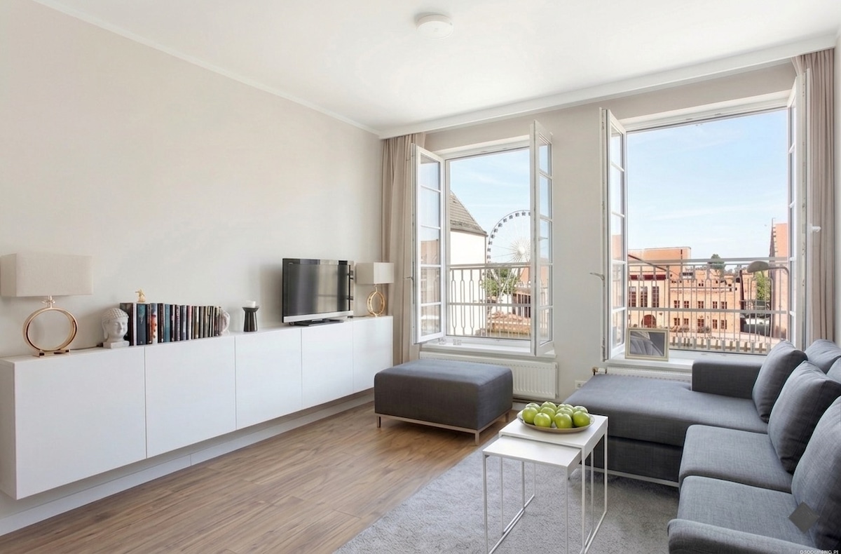 Discover Gdańsk from this stunning 60m² waterfront apartment in the historic Old Town. Perfect for families or groups, this 2-bedroom home offers breathtaking, direct views of the Motława River and city skyline. Enjoy modern amenities and a dedicated workspace. Explore famous landmarks, all just steps from your door. Comfortably fits up to 5 guests.