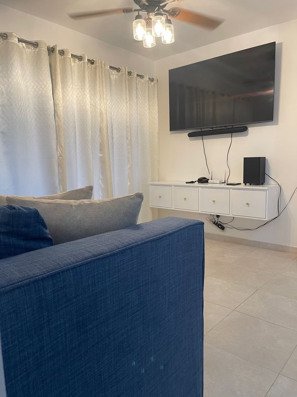 Appartament modern FL-EWWEL SULAR ġewwa Ciudad Juan Bosch, ideali għall-familji, il-koppji jew in-negozji. Għandha 2 ikmamar b' arja kkundizzjonata u TV, salott spazjuż b' TV u fann tas-saqaf, kċina mgħammra, kamra tal-ikel għal 4 persuni, magna tal-ħasil intelliġenti, smart lock u daħla awtonoma. Jinsab f' residenza kwieta u sigura, ideali biex tirrilassa. Gawdi l-kumdità, it-teknoloġija u l-istil tropikali ġewwa Santo Domingo. Ibbukkja u esperjenza tad-dar!
