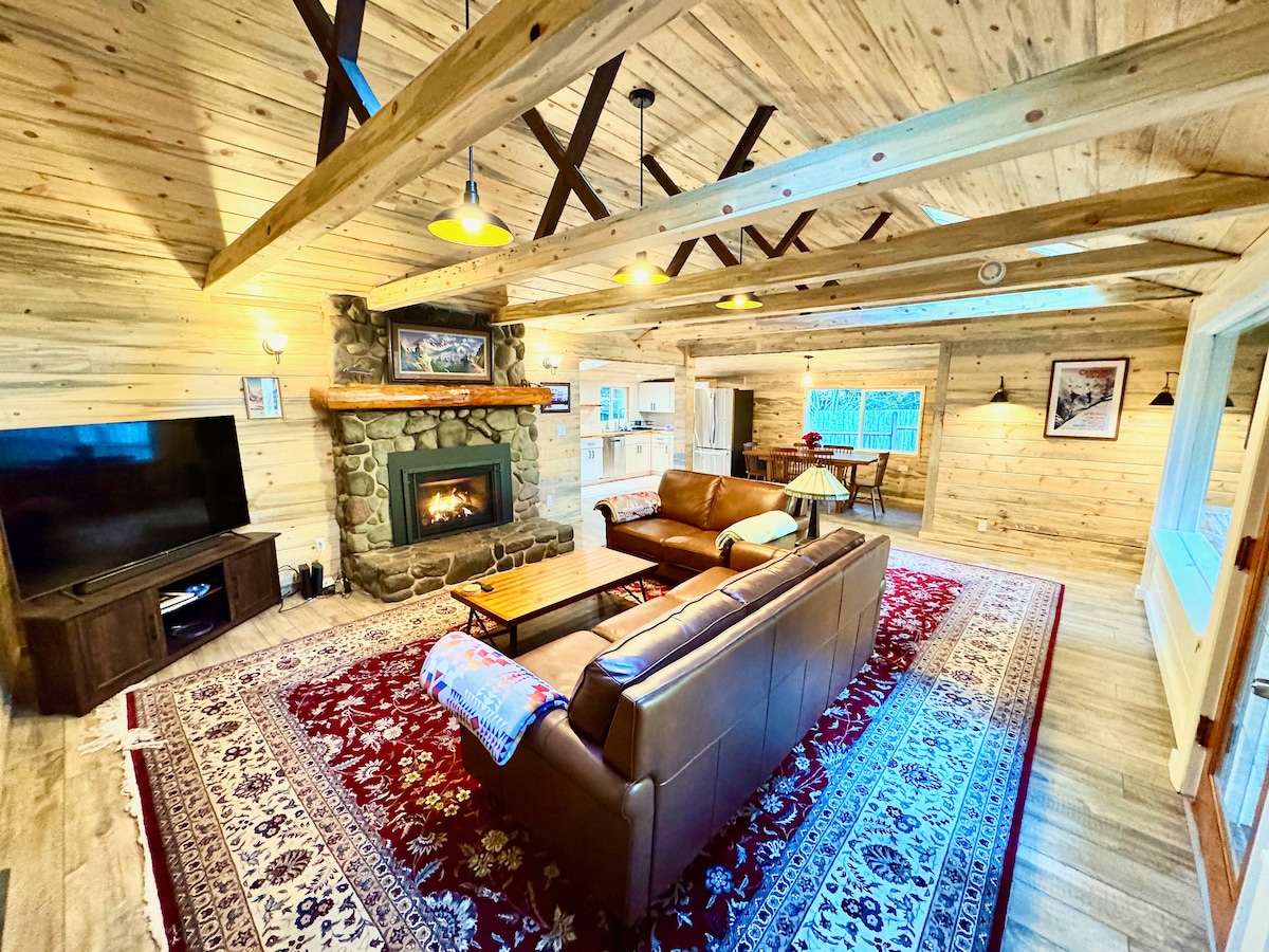 Stordament 6 acre 4br, 2.5 ba dar, kunċett miftuħ, kamra tal-midja separata b 'kamra tas-sodda tat-tojlit/sink mehmuża tinħass bħal dar tas-siġar bi tliet naħat ta' twieqi, kċina tal-kok, kwarz , azzar li ma jissaddadx. Mixja kbira madwar il-fireplace tax-xmara. Kamra tat-TV/tal-familja b 'servizzi ta' wifi/streaming smarttv ta' 65 pulzier/veduti tax-xmara' l isfel b 'aċċess faċli għax-xmara. Ġeneratur tad-dar kollha għal qtugħ ta 'enerġija rari. Bitħa, swing, fossa tan-nar, siġar kbar. Qrib ristoranti/mogħdijiet/ski/golf/spa. 3 cal king/1 queen bed. Żraben barra mid-dar:)