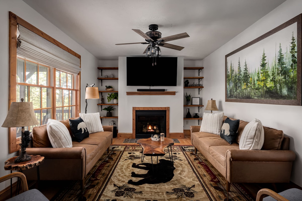 Dan ix-chalet mill-isbaħ imdawwar fuq għolja huwa mdawwar bis-siġar u fih veranda enormi madwarha, HOT TUB, fireplace tal-injam, smart TVs enormi u KAMRA TAL-LOGĦOB għall-adulti u t-tfal b' kull logħba divertenti li tista' timmaġina- pixxina, ping pong, arkati tal-vidjow PacMan, darts u aktar. Kull sodda hija ġdida u hemm sodod king u sodod trundle biex jakkomodaw viżitaturi ta' kull età. Jekk jogħġbok żomm f' moħħok li hemm tariffa żejda ta' $ 75 għall-ewwel kelb, $ 25/ea għat-tieni/it-tielet (it-tieni/it-tielet tariffa għall-klieb mitluba aktar tard).
