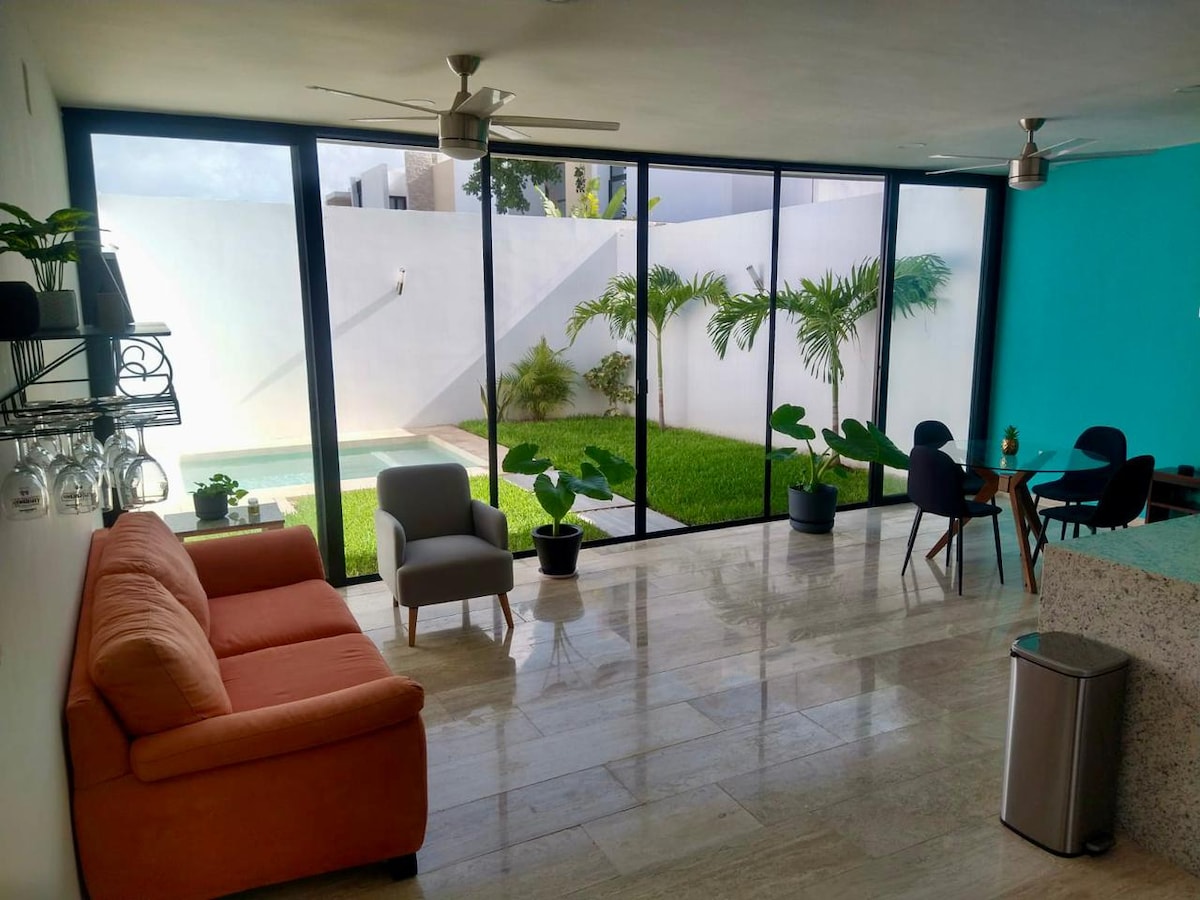 Esperjenza Casa CARUL, il-kenn ideali tiegħek ġewwa Conkal, Merida. Gawdi żoni spazjużi, 3 kmamar tas-sodda b' arja kkundizzjonata, 3.5 kmamar tal-banju, kċina mgħammra b' kollox, terrazzin spazjuż biex tirrilassa u terrazzin komdu. Din id-dar hija perfetta għall-familji jew għall-gruppi li qed ifittxu l-kumdità u l-kwiet, 25 minuta 'l bogħod mill-bajja ta' Progreso. Għaqqad l-aqwa mistrieħ u avventura fil-qalba ta' Yucatan.