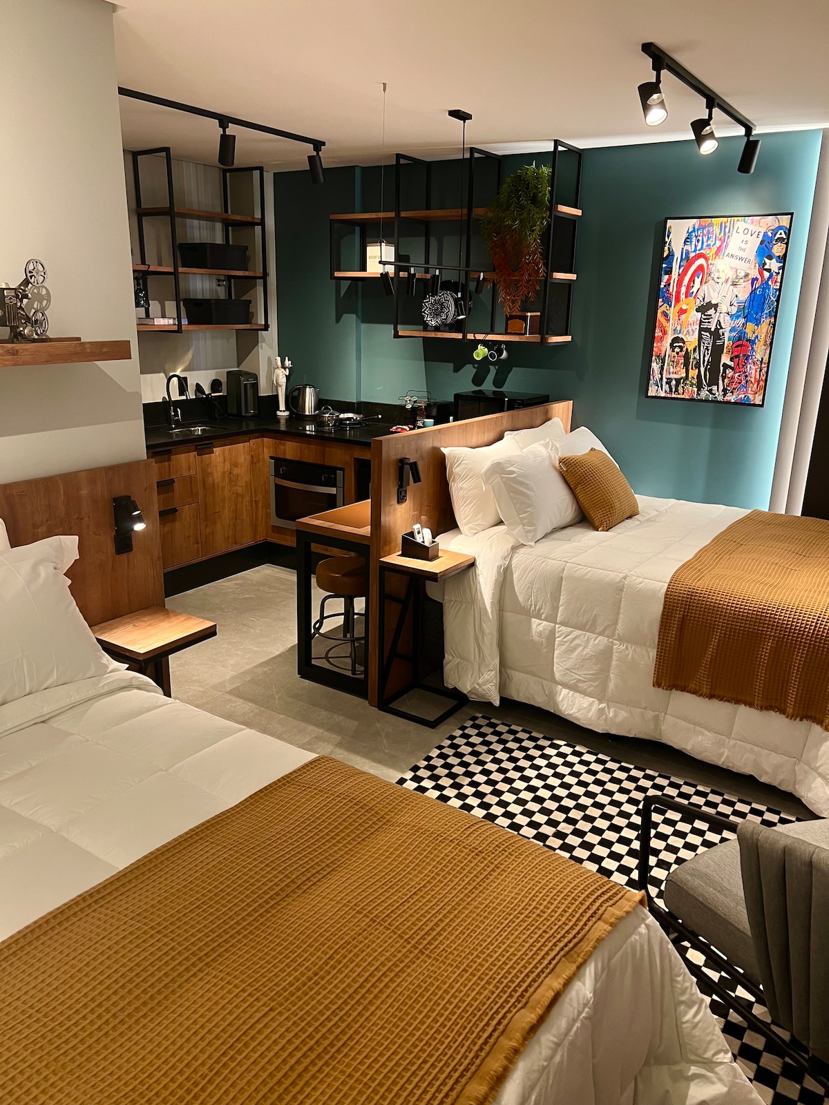 The only studio in downtown Criciúma with two real queen beds, ideal for families, couples and business travelers. Modern and fully equipped, featuring fast Wi-Fi, Nespresso and private parking. The building offers a gym, coworking, laundry and 24/7 smart market. Enjoy 24/7 smart self check-in and check-out for total convenience.