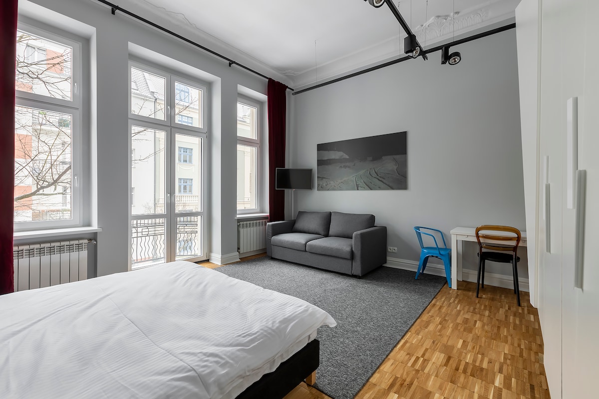 Studio ġdid b'gallarija u mezzanin f'binja tal-belt revitalizzata fiċ-ċentru tal-belt, ħdejn l-Università tal-Arti. Ftit minuti 'l bogħod mill-Pjazza tas-Suq il-Qadim. Aċċess tajjeb bit-tramm mill-Istazzjon Ewlieni u l-ajruport. Hemm lift fil-bini. Il-binja kienet il-post tad-delitt fir-rumanz kriminali ta' Ryszard Ćwirlej intitolat "Masz to jak w banku" (Kif f'bank).