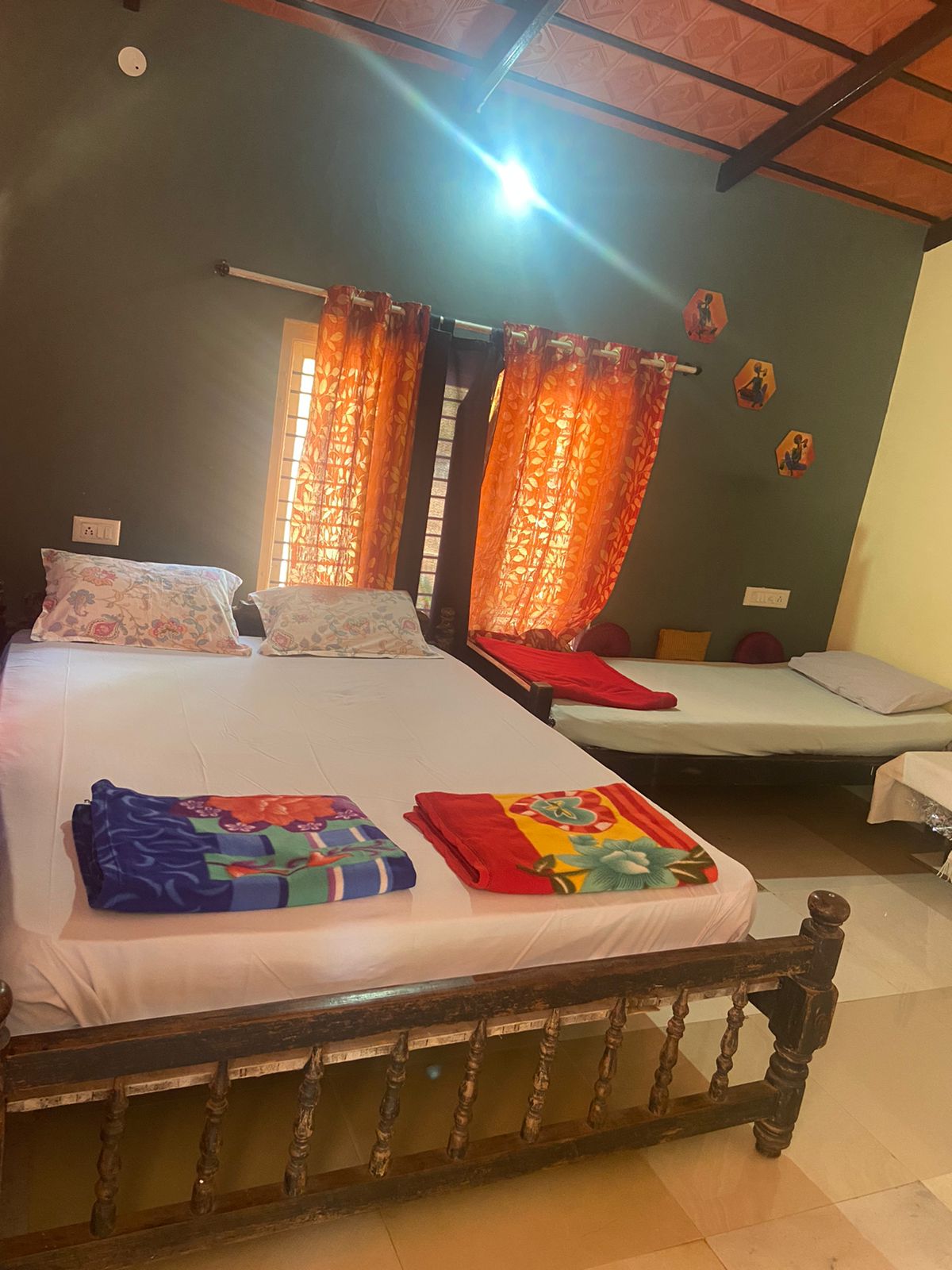 Each of our cottages is equipped with a sit-out overlooking natural valleys. The approximate area of our cottages is 15ft x 20ft. Cottage windows are fitted with a mesh to prevent insects from sneaking inside. There are no TVs. Our cottages are constructed with natural materials and are designed to have natural air circulation to keep cool inside. All our cottages are non-AC but have fans