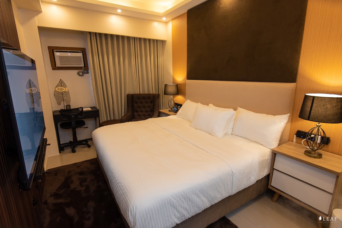 Appartament kondominjali modern b' aċċess għal lukanda u pixxina (Għandek tħallas iktar flus). Gawdi żjara eleganti u komda b' aċċess faċli għal ristoranti, ċentri, sptarijiet u skejjel. Add-on : ❣️ Parkeġġ fil-kantina - ₱ 350 / lejl Siegħa ❣️ Żejda Lil Hinn mill-Ħin taċ-Checkout - ₱ 200 / siegħa ❣️ Aċċess għall-Pool - ₱ 150 / persuna fil-jiem tas-soltu • ₱ 300 / persuna fil-btajjel (Il-pixxina hija magħluqa nhar ta' Tnejn għat-tindif skedat tal-manutenzjoni)