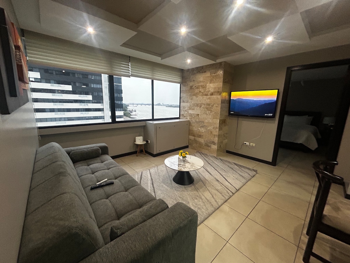 Immaġina li tqum b' veduta panoramika ta' Rio Guayas maestuż. Dan l-appartament lussuż esklussiv joffri post privileġġat biss 10 minuti mill-ajruport ta' José Joaquín de Olmedo (5.6 km) Madwar għażliet ta' ikliet sbieħ u li jinsabu 'l bogħod bil-mixi mill-attrazzjonijiet turistiċi ewlenin tal-belt, twiegħed esperjenza mill-isbaħ ġewwa Guayaquil, il-perla tal-Paċifiku. Hawnhekk se ssib Sigurtà, Eleganza u Kumdità f' kull rokna ta' dan l-appartament sabiħ.