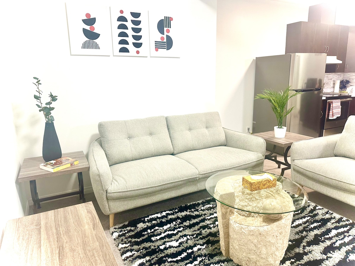 Merħba fis-suite ġdida fjamanta tagħna b' kamra tas-sodda waħda! Il-kamra tas-sodda għandha sodda queen b' saqqu lussuż u mħaded tal-fowm tal-memorja għal lejl mistrieħ. Gawdi kamra tal-banju spazjuża, ħasil tal-ħwejjeġ ġewwa unità u kċina mgħammra b' kollox bl-affarijiet essenzjali kollha. Irrilassa fis-salott komdu b'sufan, siġġu u smart TV ta' 65 pulzier b'Netflix, Amazon Prime u Paramount+. Iddisinjata għall-kumdità u l-kumdità, is-suite tagħna hija d-dar ideali 'l bogħod mid-dar. Ibbukkja ż-żjara tiegħek u rrilassa bl-istil!