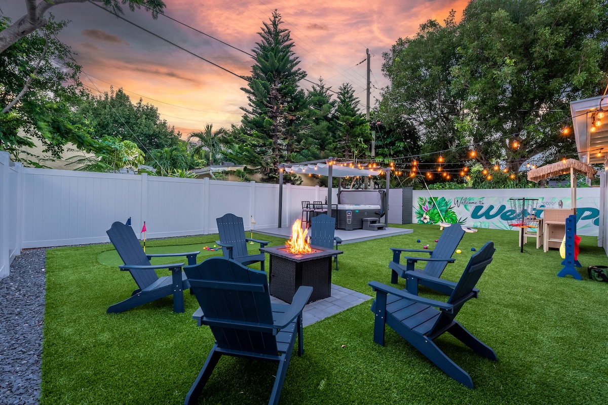 Welcome to your perfect West Palm Beach escape! *10 min from Downtown, Airport & Palm Beach Island *Comfortably sleeps 7 (King, Queen, Twins (2), Pull-Out Bed) *Turfed Backyard w/Hot-Tub, Mini-Golf, Firepit, Grill, Tiki Bar, Cornhole, Bocce *Arcade w/Pacman, Galaga, Golden Tee, Nintendo Switch, Board Games *Freshly remodeled interior (3BD/2BA) *Fully Loaded Kitchen w/Coffee Bar *Beach & Pickleball Gear (Chairs, Towels, Umbrella, Cooler, Spike Ball) *Blocks from “The Park” golf course