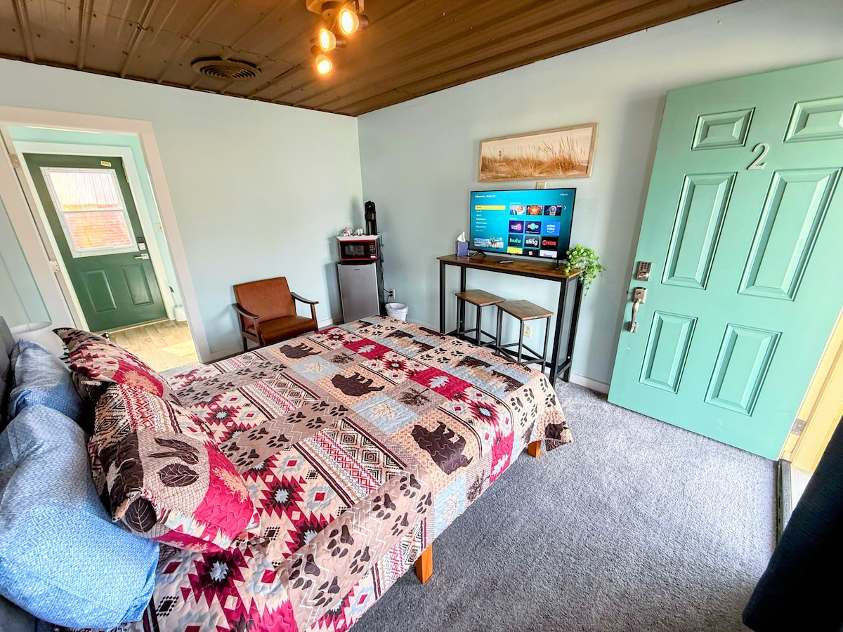 Your UP basecamp starts here. Room #1 is a fully renovated end unit with two queen beds, blending rustic style with modern comfort. Enjoy Smart TV, fast WiFi, coffee, and all the essentials, plus pet-friendly accommodations and seamless self check-in.