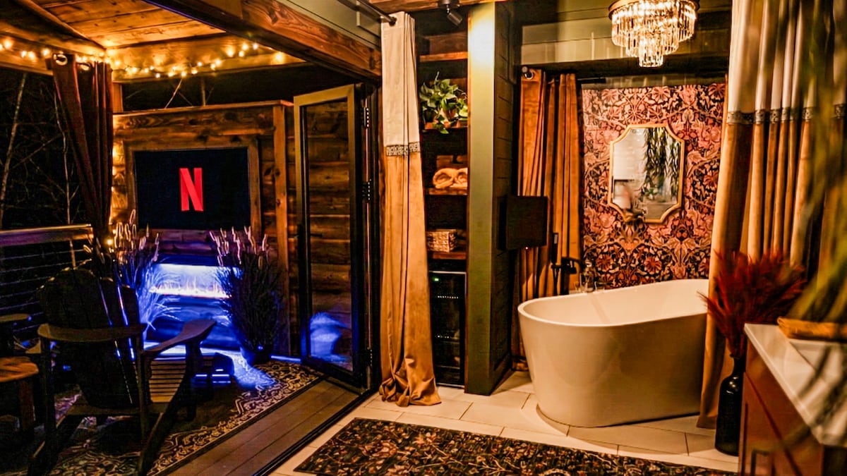 Merħba f’**Jasper ġewwa Hemlock Reserve — Il-Ġojjell Ekoloġiku ta’ Jasper.** Dan il-kabina romantika ġiet iddisinjata għall-koppji biex jistrieħu u jerġgħu jibnu r-relazzjoni tagħhom. Is-suite ewlenija għandha banju stil spa b'banju kbir weqfin taħt lampadar. Bibien doppji twal tliet metri jinfetħu kompletament għal terrazzin mgħotti fejn tista' tgawdi l-hot tub, it-TV ta’ barra u l-fireplace, kemm jekk tinżel ix-xita kif ukoll jekk tkun xemx. Hemlock & Jasper, li jinsabu fil-bosk bejn Red River Gorge u Cave Run, joffru post kenni fejn tista' taqtgħu mir-rutina ta' kuljum u tqattgħu ftit ħin ta' kwalità flimkien.