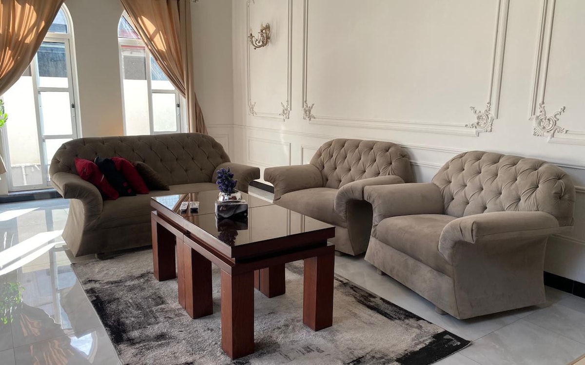 Welcome to your luxurious getaway in the heart of DHA Phase 7, Lahore. This brand-new 1 Kanal designer villa offers 5 spacious bedrooms, each with an attached bath, a modern TV lounge, and a fully equipped kitchen. Enjoy your evenings in the cozy lounge with a 75-inch Smart TV, Netflix access, and a marble fireplace that adds a touch of elegance. The interiors feature chic lighting, plush furniture, and top-quality finishes. Perfect for families, executives, or groups seeking a premium stay.