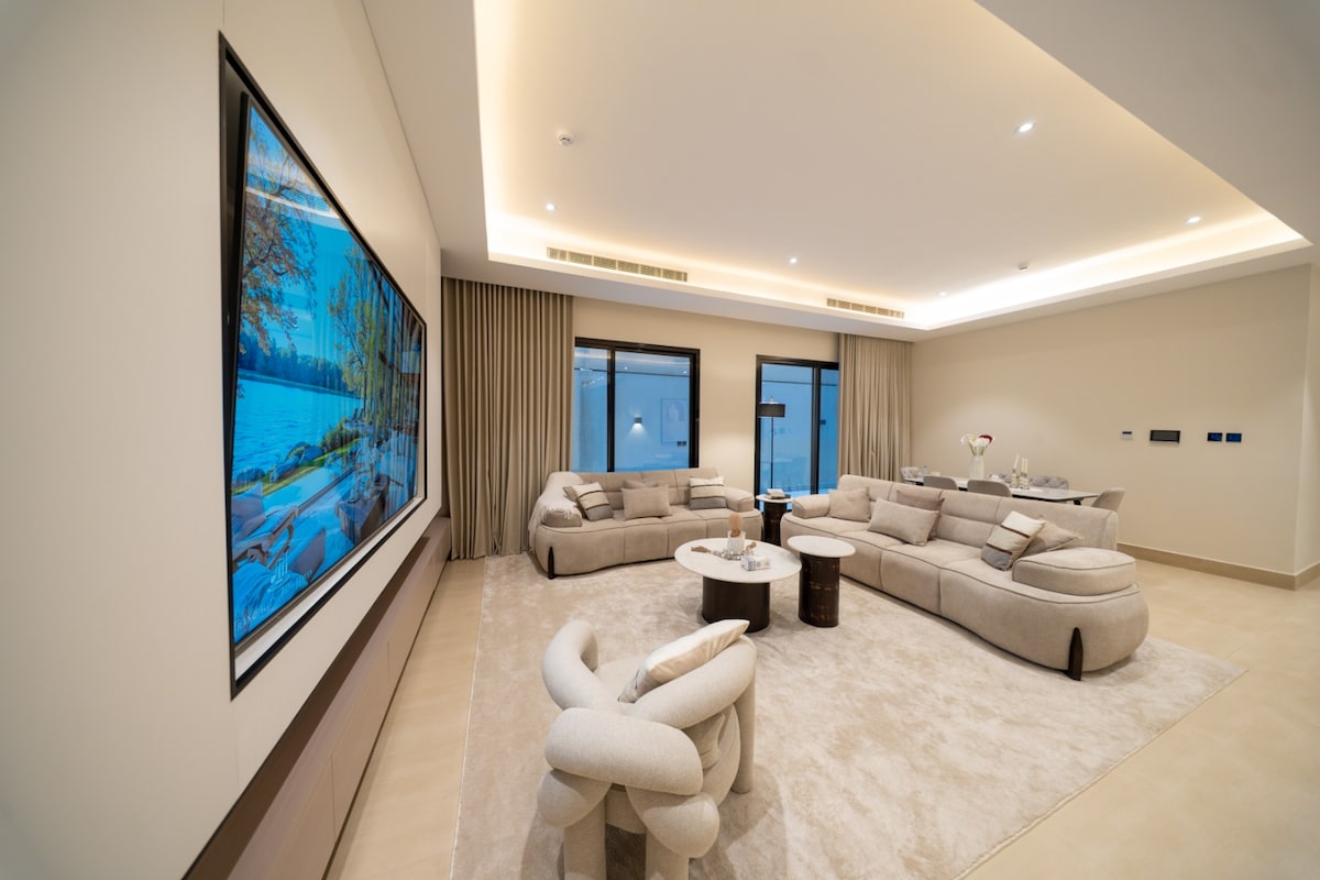 Appartament lussuż f' kompost mill-isbaħ f' viċinat prestiġjuż. Gawdi veduti mill-isbaħ tal-ġnien mit-tieqa tiegħek, kċina mgħammra b' kollox, magna tal-kafè u TV intelliġenti ta' 75 pulzier. Post mill-aqwa qrib l-iktar postijiet interessanti għat-turisti u postijiet tad-divertiment — fosthom Diriyah, Boulevard City, Boulevard World u iktar. Il-Korsa tal-Isport tinsab biss 2 minuti 'l bogħod bil-karozza, filwaqt li l-Kumpless Thagher huwa wkoll biss 2 minuti 'l bogħod u joffri għażla wiesgħa ta' ristoranti, kafetteriji u ħwienet.