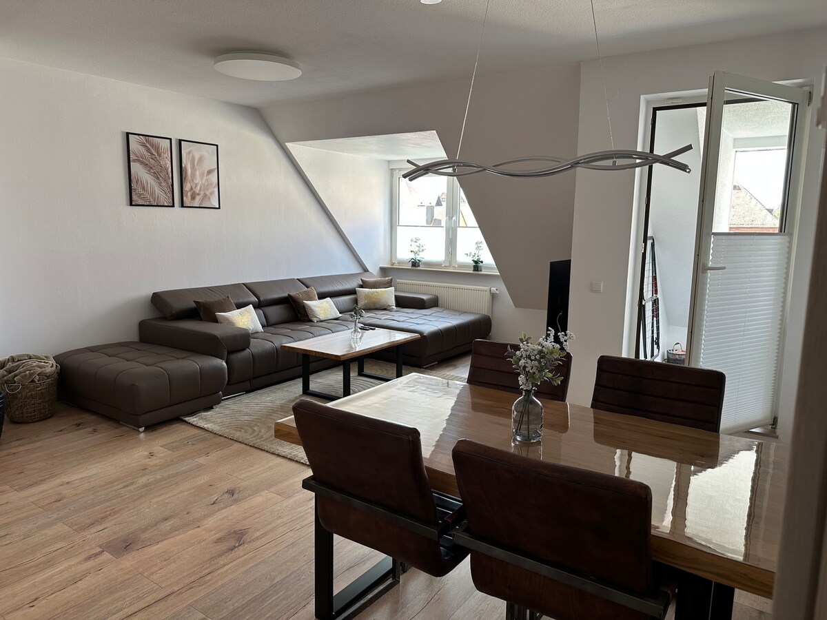Attiku ta 'qabel f' bini antik affaxxinanti ġie estiż fi studio b' attenzjoni għad-dettall fl-2016. Ma tant hemm xejn x 'tixtri fiha. Ħruġ żgħir fuq il-bejt iħares lejn il-bjut ta 'Nuremberg. Fl-ispazju komdu u uniku tħossok qisek qiegħed id-dar u tista 'tgawdi l-kalma. Ċentralment iżda kwiet ħafna, tista 'tilħaq iċ-ċentru ta' Nuremberg f' 10 minuti bil-metro.