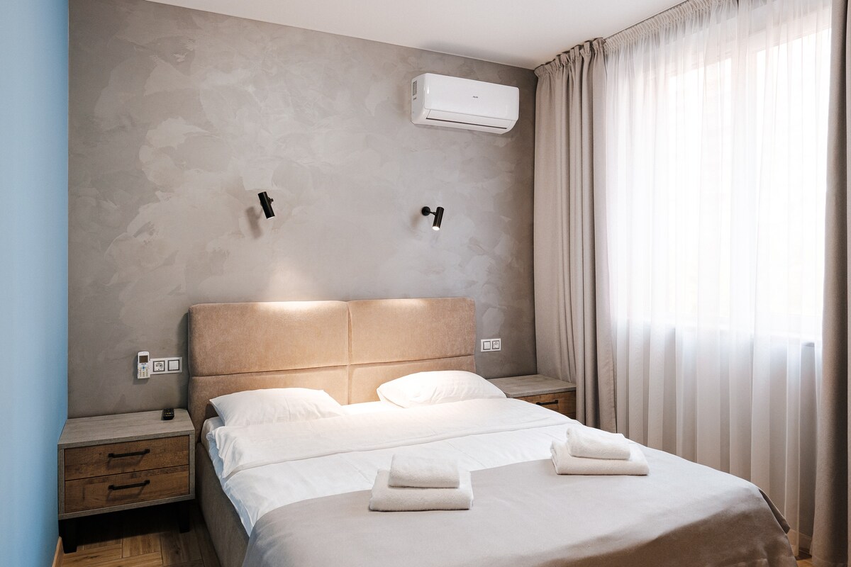 Discover minimalist peace in our designer 1-bedroom apartment in Kyiv’s heart. Space: Queen bed, Smart TV, AC & high-speed Wi-Fi. Kitchen: Fully equipped with coffee/tea. Location: New building near Universytet Metro & Shevchenko Park. Quiet, yet steps from top cafes. Perks: Private balcony, city views, and easy self check-in. ✨ Clean, serene, and perfectly located. Book your unique Japandi experience today!