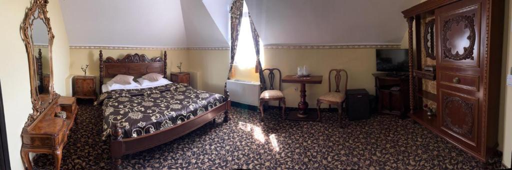 Camera 9 DUBLA DE LUXE cu baie proprie, dotata baie propri cu cada este situată la mansarda este cea mai spatioasa camera din hotel. Cu un pat mare, spațios, pe mijloc, decorată în stil old-time, cu bun-gust, spațioasă, încăperea vă va introduceîntr-o epocă plină de mister. Suplimentar are adaugata si o canapea extensibila. Baie spatioasa cu cada Camerele sunt dotate cu : -Mobilier Ludovic -Masa si scaune -Masa de toaleta -TV -Mini-Bar -Articole de baie -Papuci, halat si prosoape