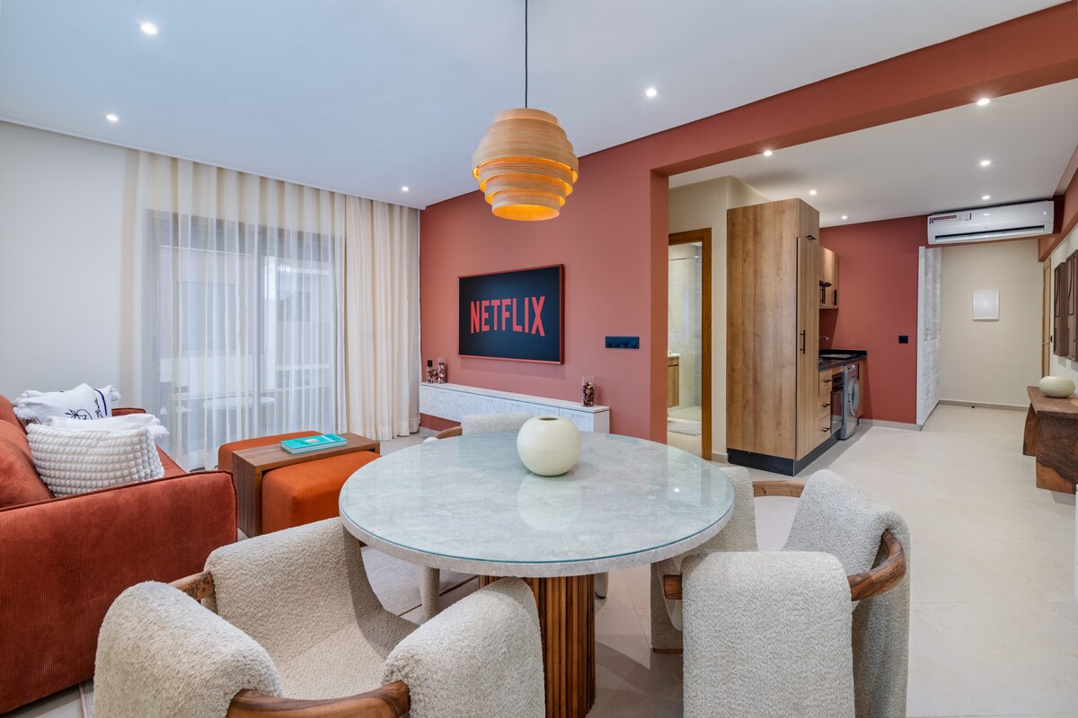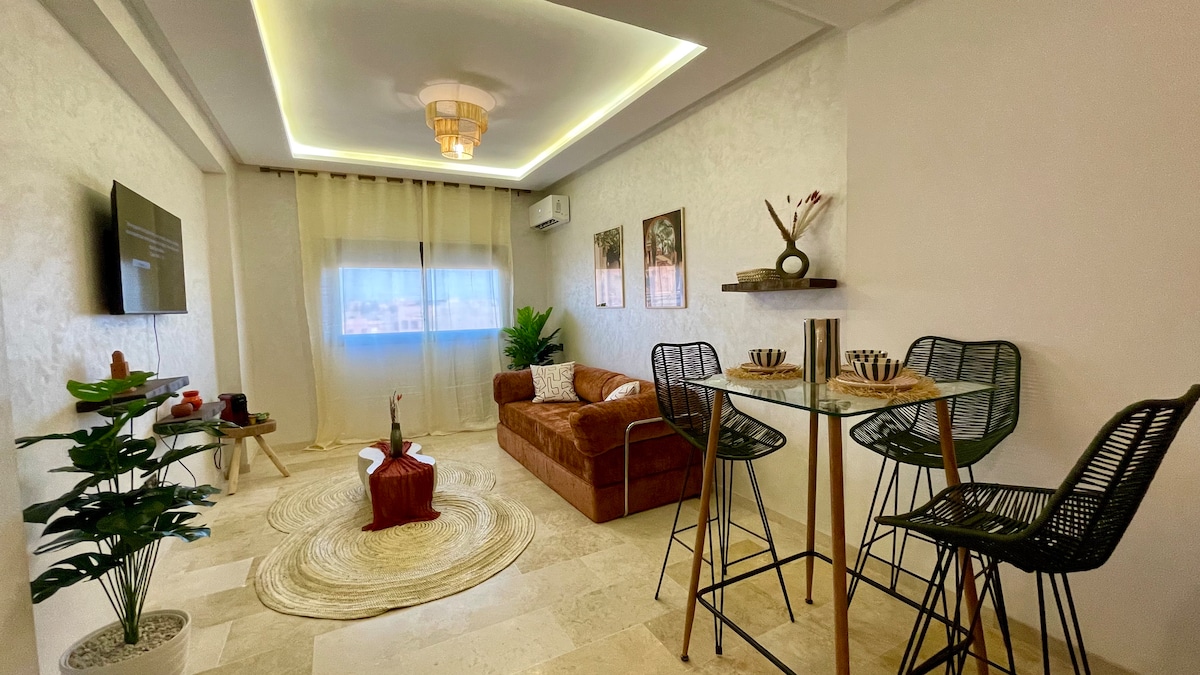Merħba fl-appartament ġdid, modern u eleganti tagħna, imżejna bi ħsieb għall-vjaġġaturi li japprezzaw il-kumdità u l-kwalità. Gawdi bjankerija tas-sodda ta' grad mediku, internet tal-fibra ottika b' veloċità għolja u Netflix fuq Smart TV kbir. Tinsab fiċ-ċentru tal-belt, 3 minuti bil-karozza 'l bogħod mill-Istazzjon tal-Ferrovija ta' Marrakech. Ħwienet konvenjenti jinsabu eżatt 'l isfel għall-ħtiġijiet ta' kuljum tiegħek. Ideali għal żjara rilassanti u konnessa fil-qalba tal-belt!