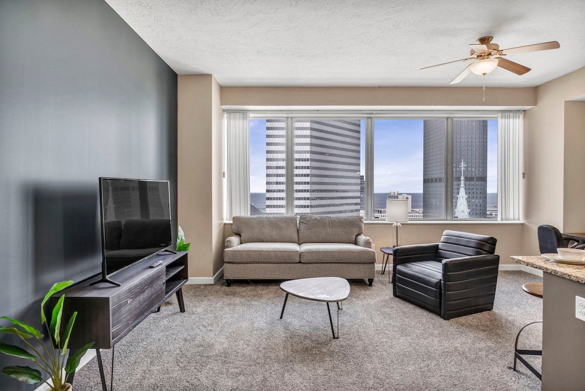 You can stop your search now. You just found the perfect place to book for your trip to Cleveland. ➹ Clean. Robust Amenities. Modern Finishes. Quick Host Responses. ➹ You're going to be located at the CENTER of everything in Downtown Cleveland. ➹ Get a good night's sleep with our memory foam beds. ➹ Spend your daytime working from home at our private home office. Cook a meal for your group in our beautiful, timeless kitchen. Then spend your evenings relaxing with our 65" Smart TV.