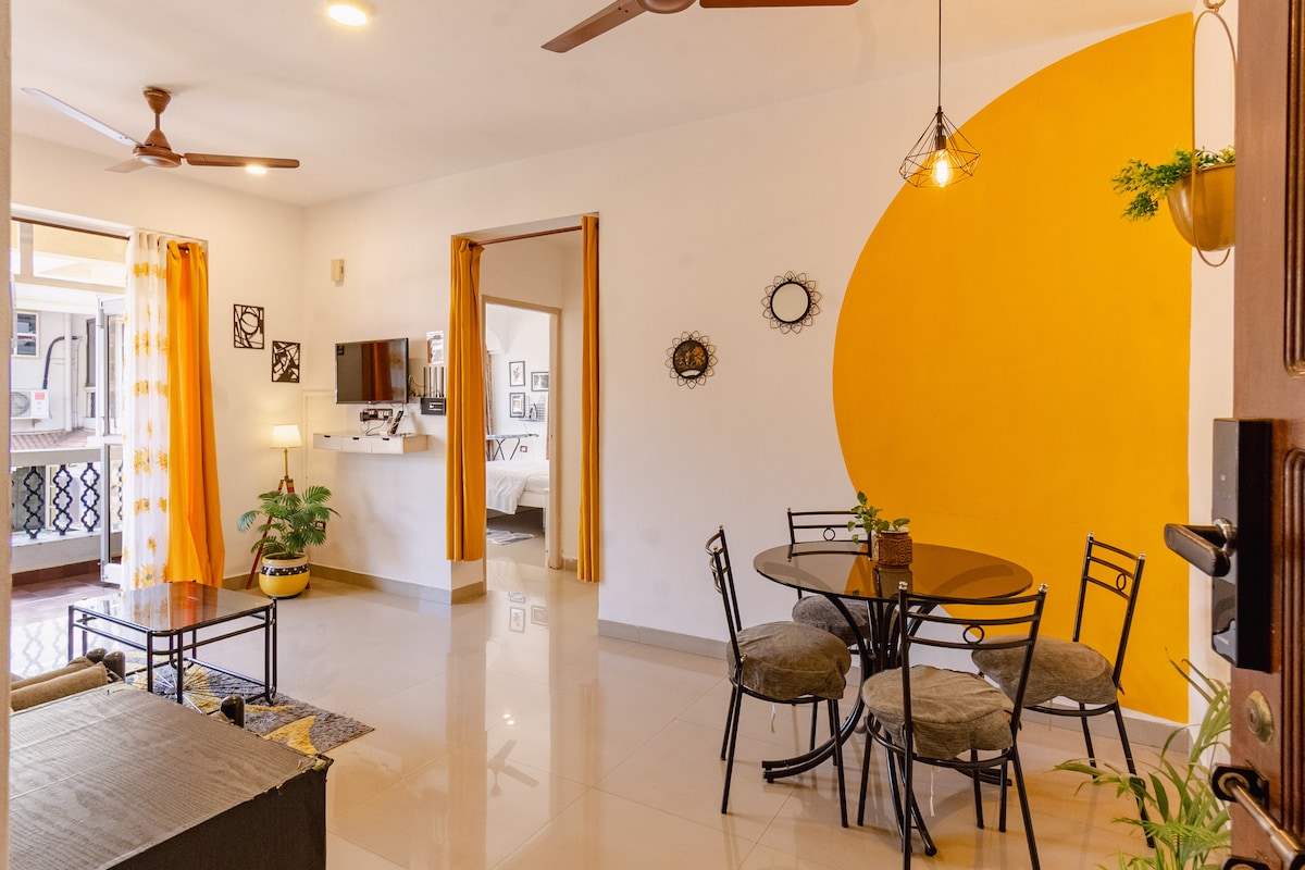 Relax & unwind in this spacious and serene space that is aesthetically designed keeping all the beach vibes in mind.Tucked in a peaceful lane surrounded by greenery & Opposite a 5star hotel.The apt is a short 5min ride to one of the best beaches in SouthGoa. Packed with all appliances & a fully functional kitchen, you can easily stir a meal.The apt also has power backup incase of power cuts so that your WFH does not get disrupted.Equipped with high speed 150MBPS wifi connection for your WFH need