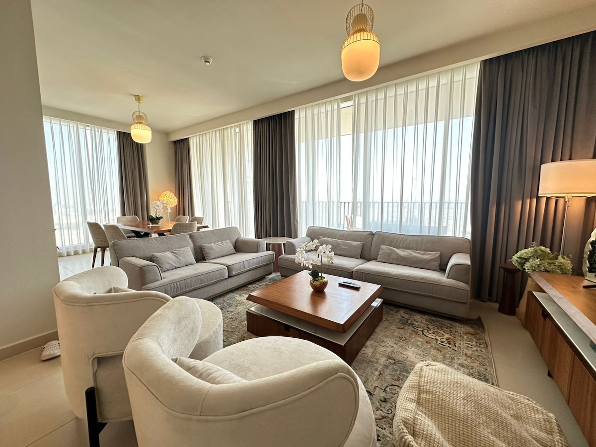 This luxurious 1-bedroom apartment offers comfortable living with all the amenities you need, located in The Grand in Dubai Creek Harbour, an amazing area in Dubai. Enjoy free access to a heated Pool with a view, gym, and free parking. The living room has a comfy couch and HD TV with Prime Video, and AppleTV+ for you! The balcony opens an AMAZING VIEW. The apartment is FULLY-EQUIPPED with everything you could need and we are happy to provide whatever is needed during your stay!