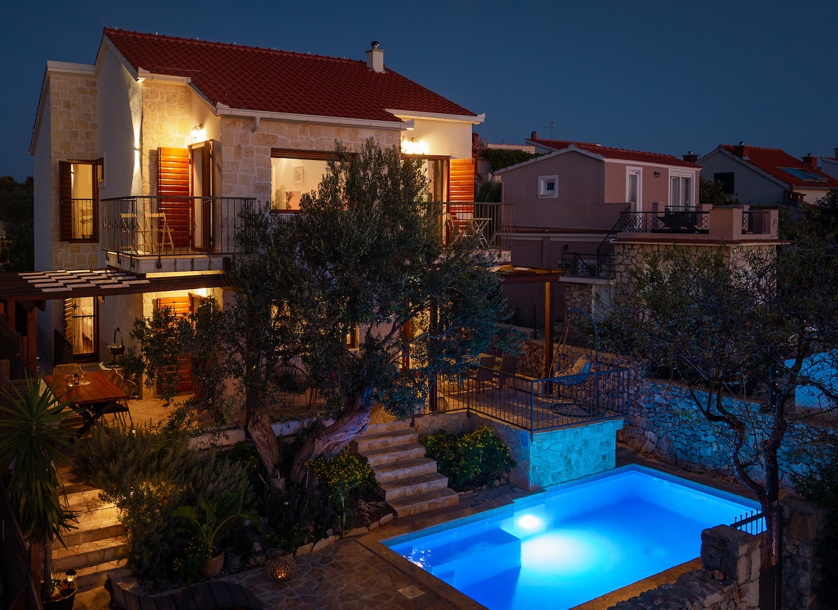Dar b 'disinn sabiħ fuq ġewwa u fuq barra li tinsab f' ambjent idiliku b 'veduti mill-isbaħ qrib il-bliet storiċi ta' Trogir u Split. Id-dar għandha terrazzin spazjuż b' fireplace u pixxina. Post ideali għal familja jew grupp ta' ħbieb biex jistrieħu. Ġnien magħluq li jippermetti lill-għeżież tiegħek igawdu l-logħba liberament.