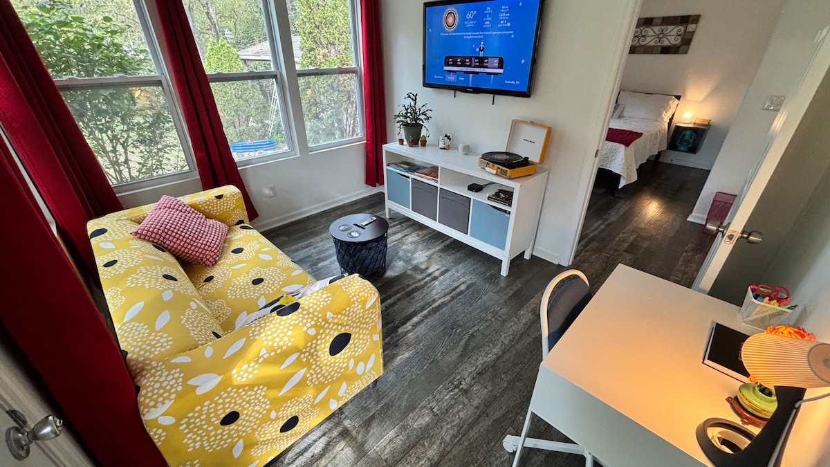 Dan l-aħħar lestejna r-rinnovazzjoni tad-dar tagħna, li tinkludi suite tal-klijenti ħelwa u komda b 'kamra tas-sodda waħda. Il-klijenti se jkollhom aċċess għad-daħla privata tagħhom stess permezz tad-deck tagħhom ta '16 x 24 pied. Is-suite tinkludi kamra tas-sodda b 'purtieri li ma jħallux id-dawl jidħol, magna tal-ħoss, kamra tal-banju b' banju/doċċa flimkien, kċina żgħira (friġġ kbira, sink, magna tal-ħasil tal-platti, burners tal-induzzjoni, forn toaster, microwave), mejda tal-ikel u spazju fejn tgħix b 'sufan, rokna għall-qari u TV.