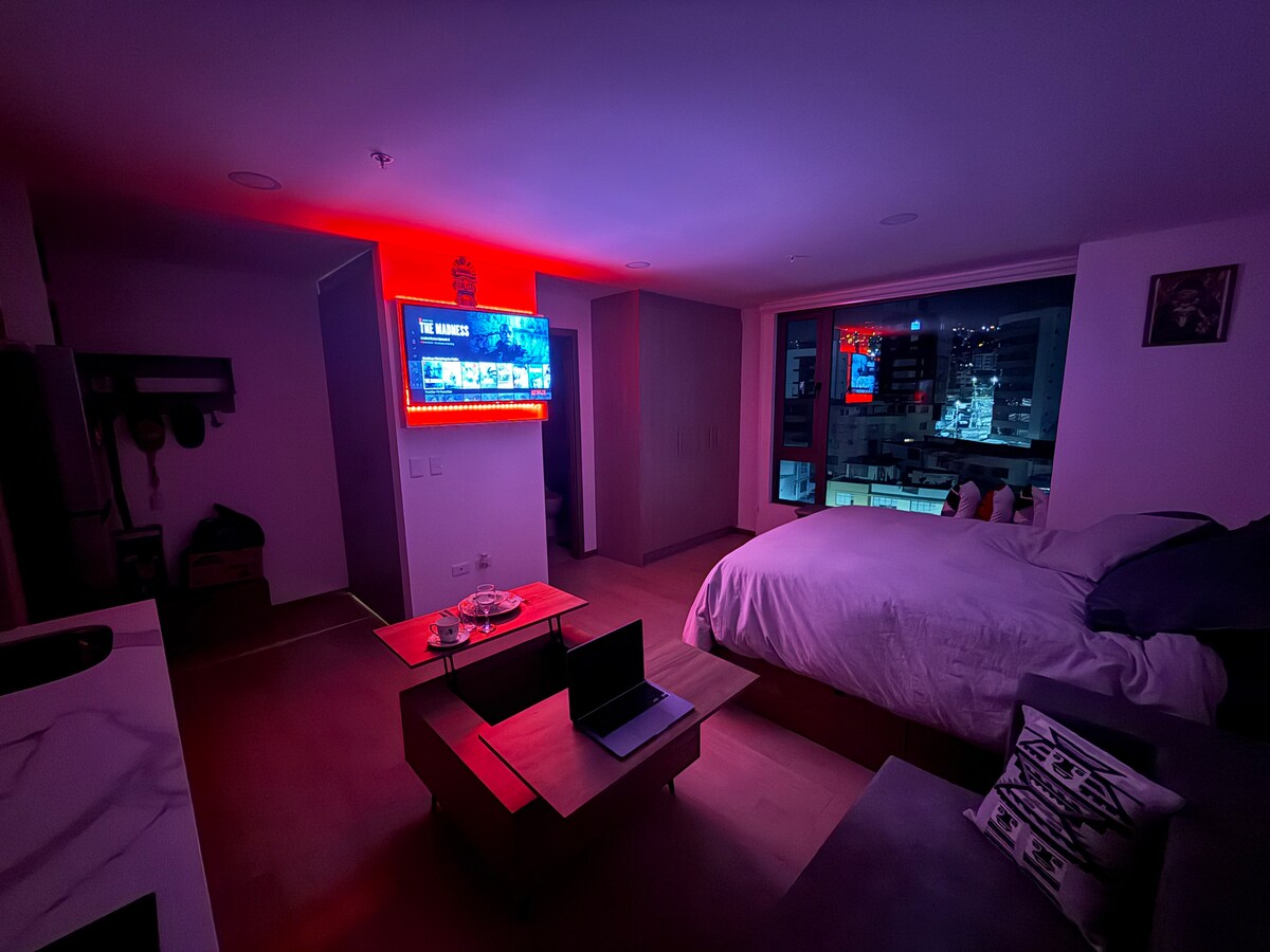 Mini suite moderna kompletament indipendenti, b' veduta panoramika mill-isbaħ ta' Quito. Tinsab fl-aqwa settur tal-belt, La Carolina, il-qalba ta' Quito modern. Il-bini jinkludi pixxina, Jacuzzi, sawna, banju Tork, gym, żona fejn taħdem flimkien u servizz tal-ħasil tal-ħwejjeġ. Għandna Netflix u WiFi b' veloċità għolja.