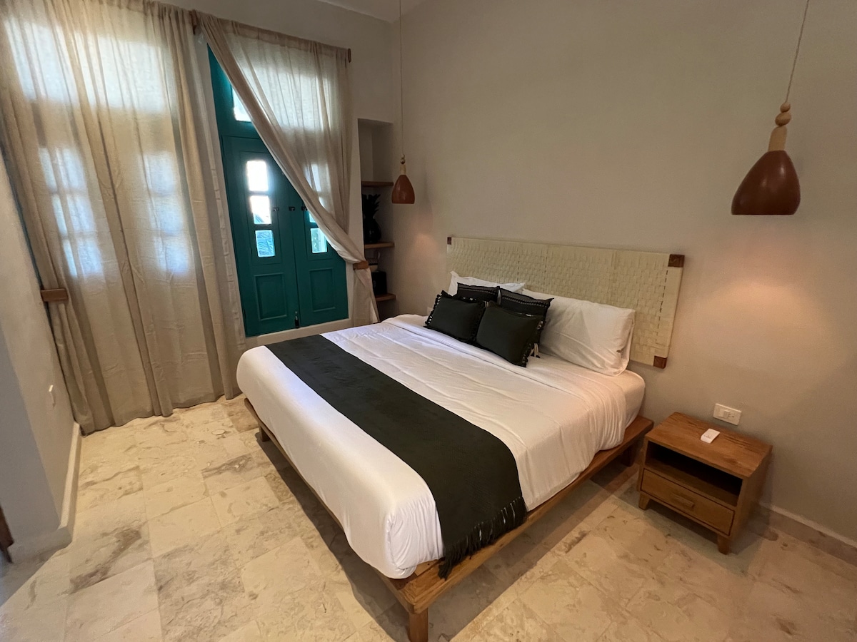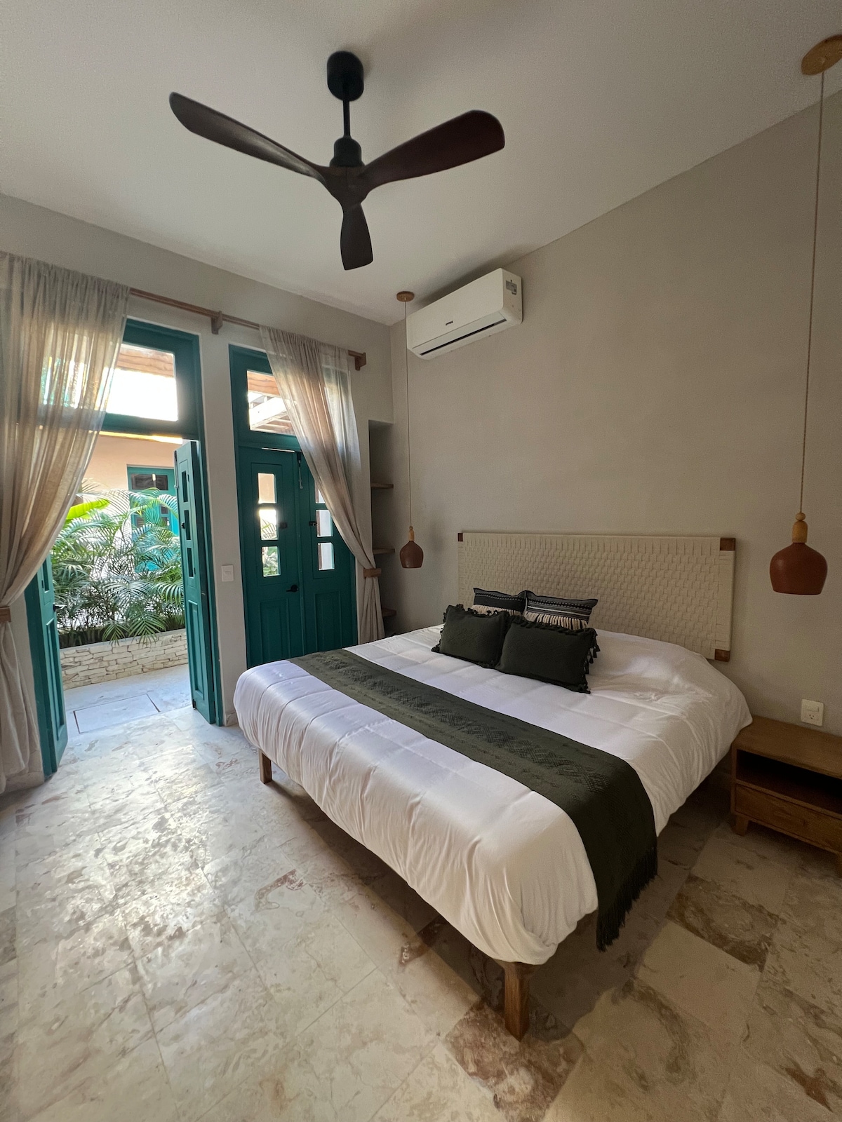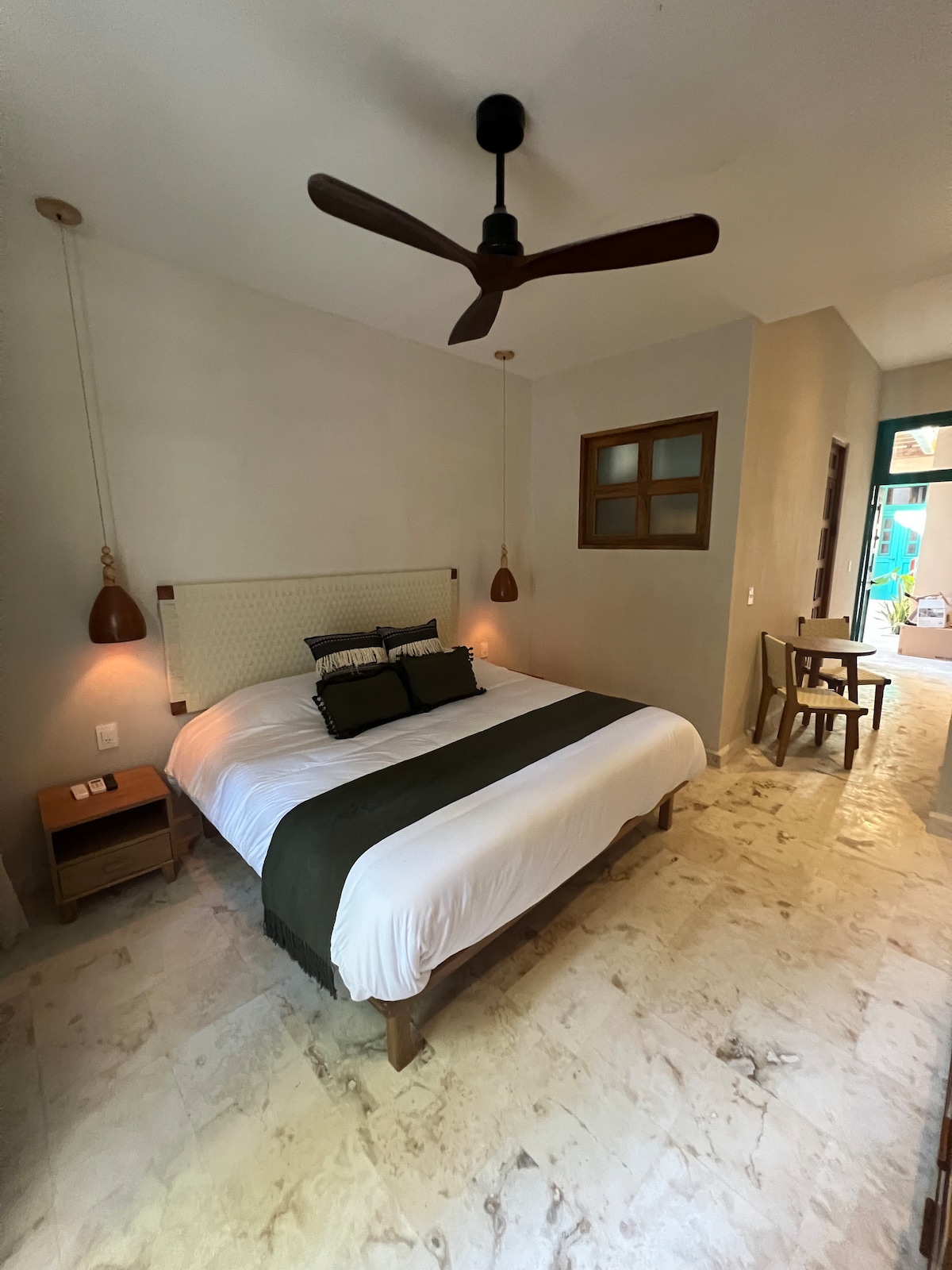 K’áan room is a bright, comfortable retreat located on the second floor of the hotel. It features a king-size bed, a fully equipped kitchen, TV, Starlink high-speed Wi-Fi, and toiletries—everything you need for a relaxed, easy stay. Guests have access to the rooftop, where you can enjoy the pool, unwind in the sitting areas, and take in beautiful sunsets over El Cuyo. A simple, peaceful space designed for rest and slow days.