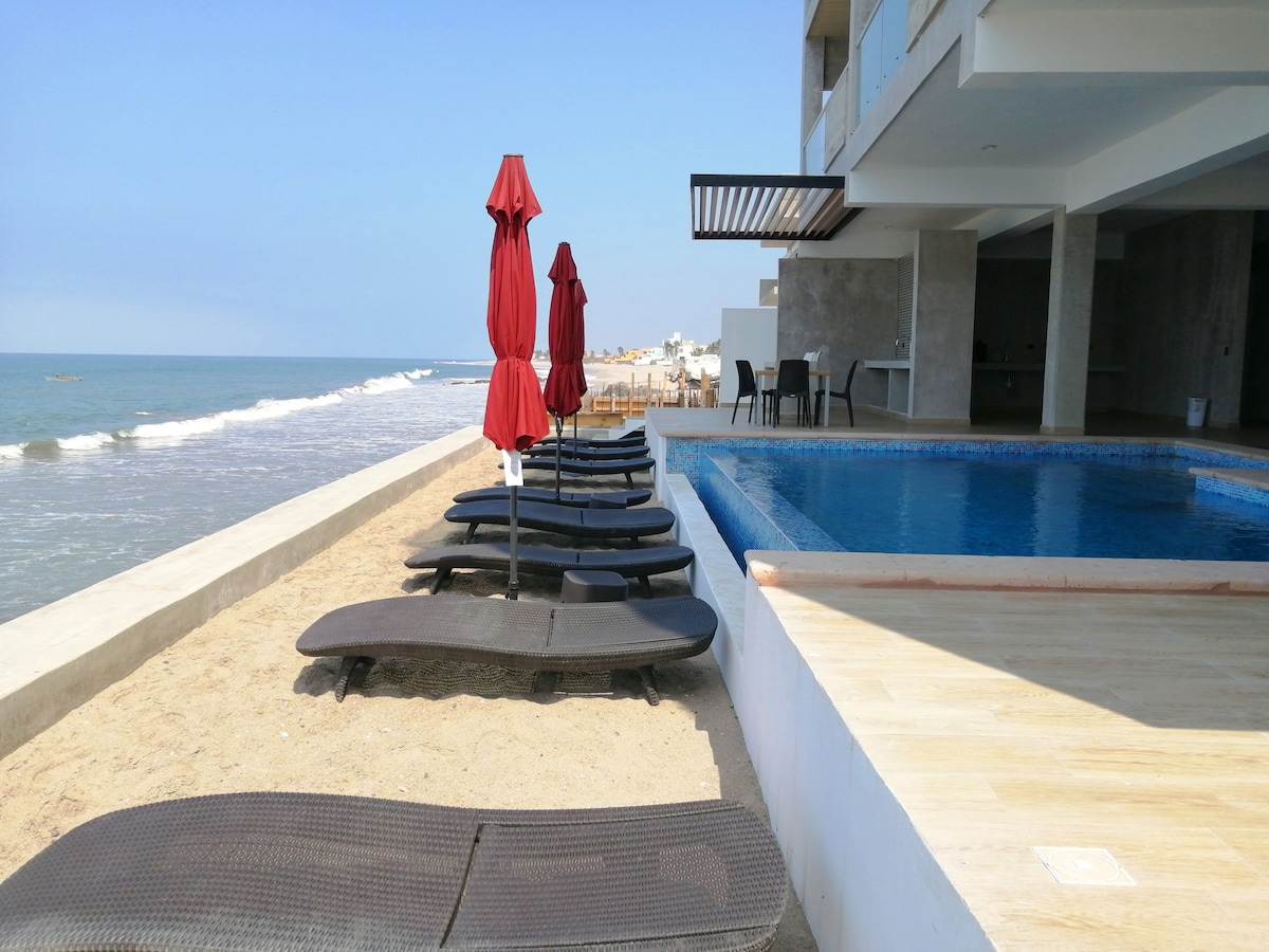 Despierta frente al mar 🌊 Este departamento a pie de playa te regala una vista directa al mar desde la sala y el balcón. Aquí no necesitas salir para disfrutar el paisaje: el sonido de las olas y los atardeceres increíbles son parte de tu día. El espacio es cómodo, fresco y perfecto para disfrutar en pareja, con amigos o en familia, en una de las mejores ubicaciones para vivir la experiencia de playa al 100%.