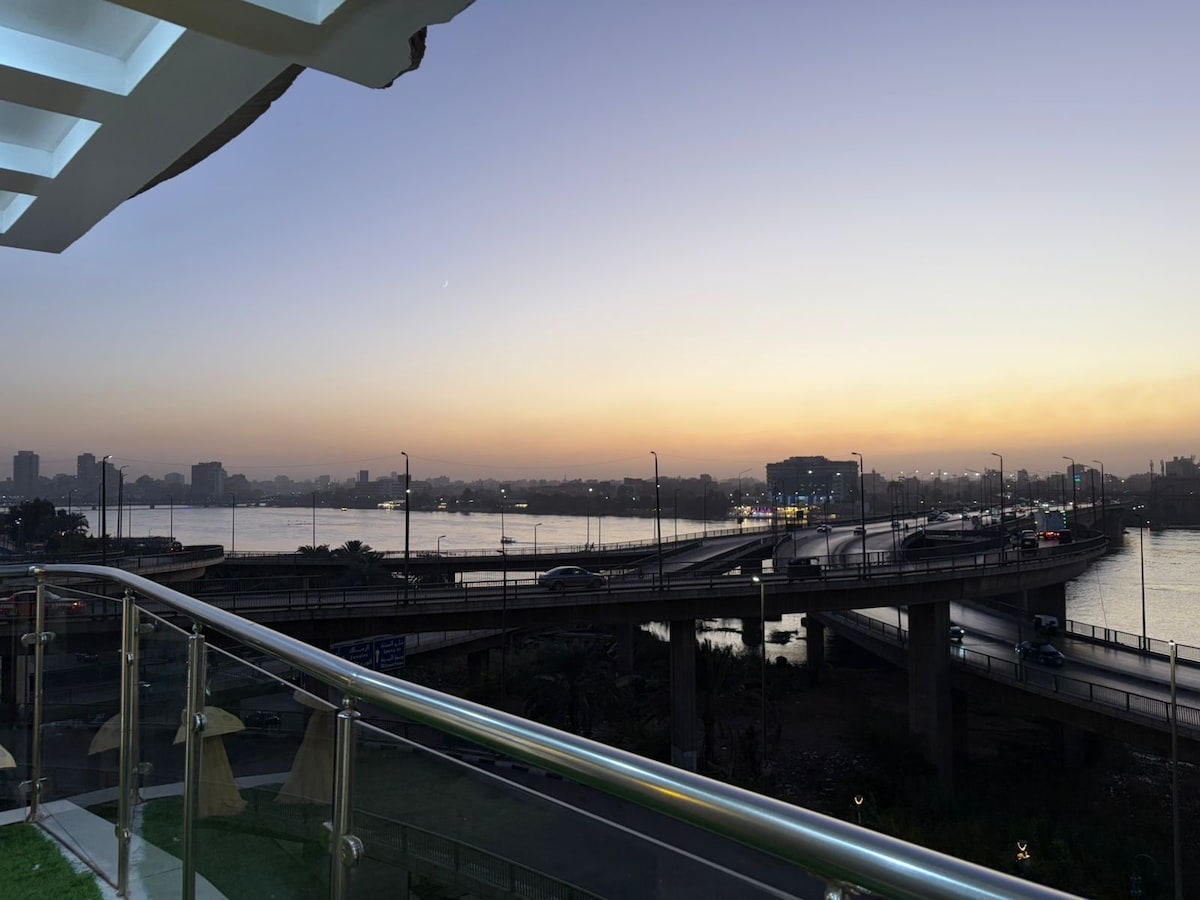 Luxury Apartment with Panoramic Nile View in Cairo This large apartment offers stunning Nile views, 3 comfortable bedrooms, 2 bathrooms, and a balcony with a coffee corner. All rooms are air-conditioned. Equipped with a smart TV, a fully stocked kitchen, and more. Perfect for families or individuals looking for a relaxing stay in Cairo. Surrounded by all daily essentials.