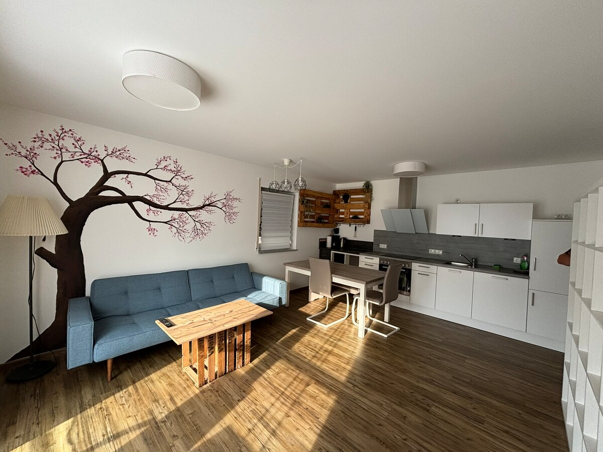 Madankollu, post kwiet b' links tat-trasport tajbin fid-direzzjonijiet kollha. Madwar 7 minuti mixi sal-waqfa tal-ferrovija tal-belt. F' madwar 5 minuti sewqan sal-aċċess għall-awtostrada fid-direzzjonijiet kollha. Heilbronn u Neckarsulm jistgħu jintlaħqu f' minuti permezz ta' triq tal-pajjiż. Xiri fuq il-post(parzjalment b' mixja qasira): Edeka, Kaufland, Lidl, Aldi, diversi Furnara. Rikreazzjoni: Waldheide Natural Monument, l-Istadtseebach Valley, Burgruine Weibertreu jistiednuk timxi. Mixi 'l bogħod mill-appartament!