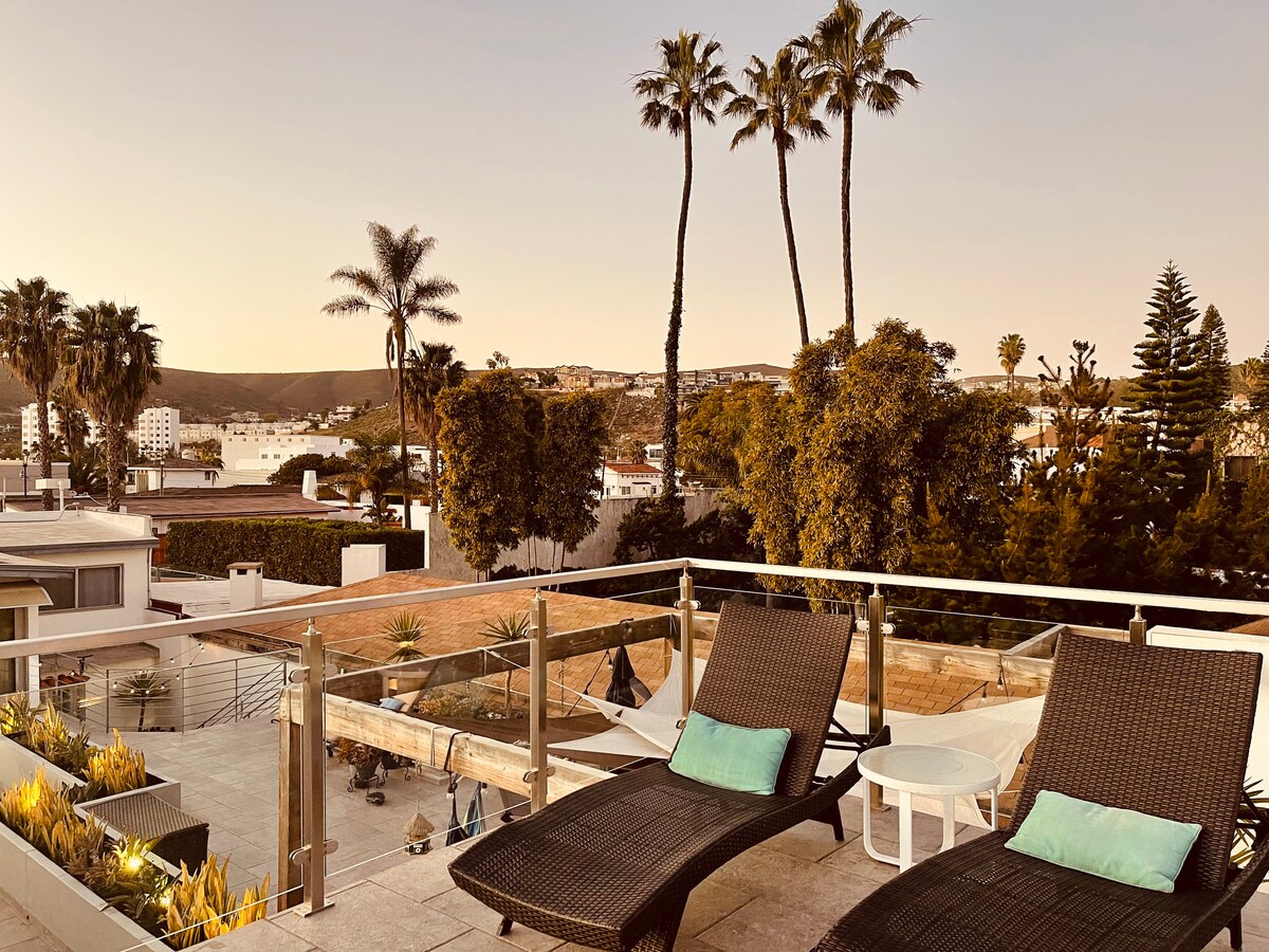 Gawdi l-veduti tal-oċean u n-nżul ix-xemx ta' Baja mit-terrazzin spazjuż ta' fuq il-bejt ta' did-dar komda. Id-dar tinsab f’komunità lussuża magħluqa fl-aqwa żona tal-lukandi ta’ Ensenada u toffri arja kkundizzjonata u tisħin, spazji sbieħ fuq barra u ambjent rilassat. Imxi sa ristoranti, birreriji tal-artiġjanat, ħwienet tal-kafè u swieq mill-aqwa. Biex tasal fiċ-ċentru tal-belt teħtieġ biss 5 minuti u madwar 15-il minuta biex tasal fl-industriji tal-inbid ta' Valle de Guadalupe, għalhekk huwa l-post ideali għal tmiem il-ġimgħa taħt l-inbid u għal vaganzi mal-kosta.