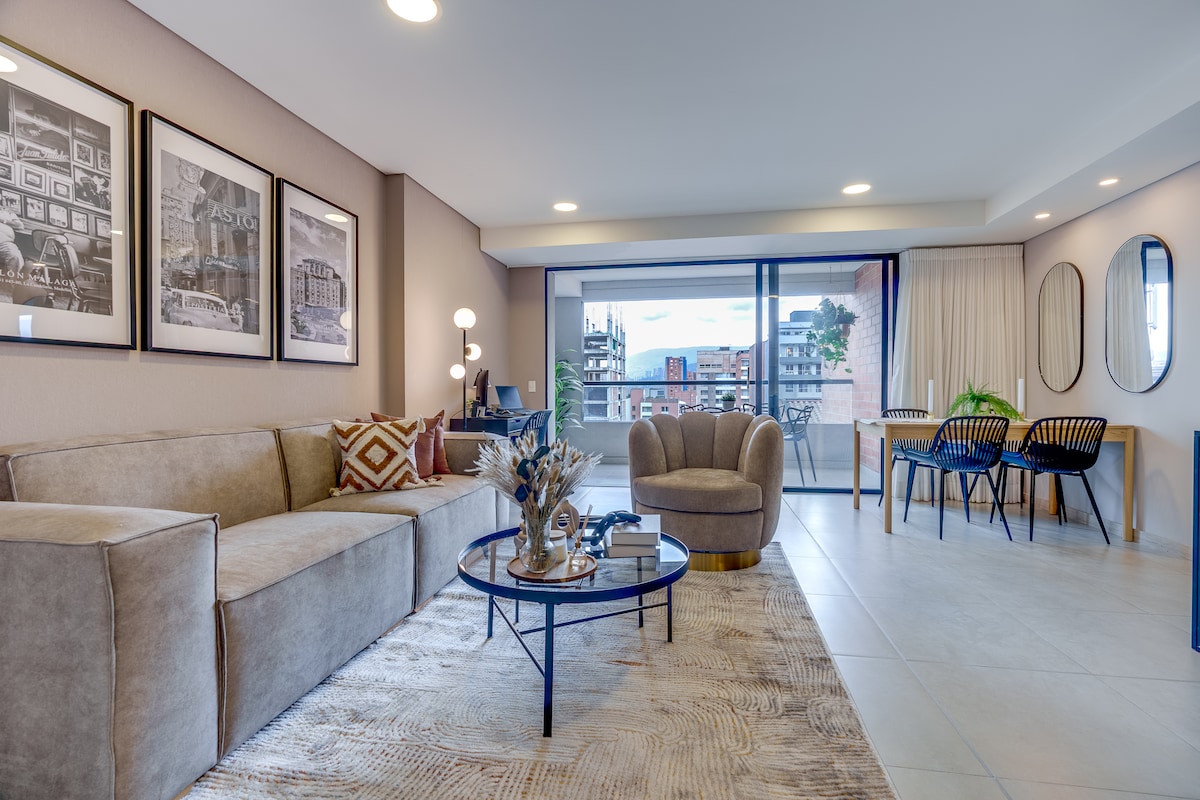 Modern and bright apartment with a balcony and stunning city views in Envigado🍃. It features two bedrooms, a comfortable living area, a fully equipped kitchen, two bathrooms, in-unit washer and dryer and private parking. Located in Loma del Escobero, in a residential area, just a 3-minute walk from City Plaza Mall, where you will find supermarkets, restaurants, gyms, a movie theater, and more 🛍️. Flexible check-in.