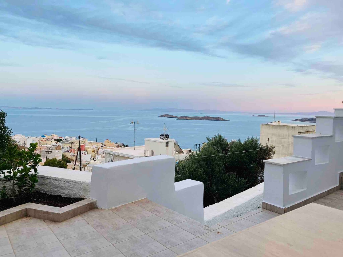 Siroa View titla' 'l fuq minn Ermoupoli, u toffri veduti mill-isbaħ tal-baħar u tal-belt. It-terrazzin spazjuż tiegħu b' żona tal-ikel fuq barra u salott inkorporat huwa l-ambjent perfett għal filgħodu rilassat, inżul ix-xemx tad-deheb u filgħaxijiet imdawla bl-istilel. Ġewwa, id-disinn ta' ġewwa ffirmat iħallat it-tonijiet ta' Syros sħan ma' materjali naturali u affarijiet maħduma bl-idejn. B' żewġ kmamar tas-sodda, żewġ kmamar tal-banju u kċina sħiħa, hija ħarba eleganti ftit passi 'l bogħod miċ-ċentru vibranti, li toffri veduti mill-isbaħ u kumditajiet maħsuba.
