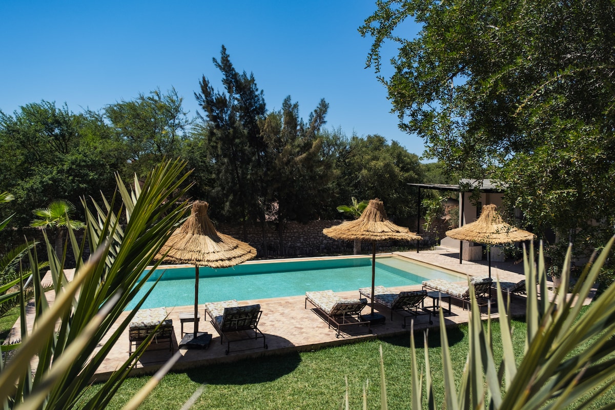 "TARGANINE Lodge" tinsab fil-qalba tar-raħal ta' Ghazoua 8 km 'il bogħod minn Essaouira u l-bajjiet impressjonanti ta' Sidi Kaouki. Il-propjetà toffri f' ambjent kwiet b' ħafna siġar argan ħodor:3 suites indipendenti ta' 50 m2 kull waħda b' terrazzin u fireplace privati u 2 kmamar tas-sodda doppji ta' 16 m2 kollha b' veduti tal-pixxina ta' barra. Dan il-post fejn toqgħod eleganti huwa tajjeb għall-gruppi.