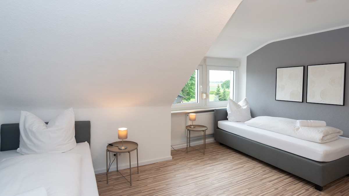 Merħba fil-kamra doppja komda u li għadha kif ġiet rinnovata tiegħek ġewwa Tiergartenstraße 288 f'Wuppertal. Fil-kamra hemm sodda ta' 140 ċm, skrivanija moderna u friġġ privat – ideali għall-koppji jew għall-vjaġġaturi tax-xogħol. Gawdi minn Wi-Fi b'veloċità għolja, self checkin, post kwiet u aċċess malajr għas-S-Bahn (ferrovija suburbana), iċ-ċentru tal-belt u ż-Żoo ta' Wuppertal. Ideali għal żjara komda.