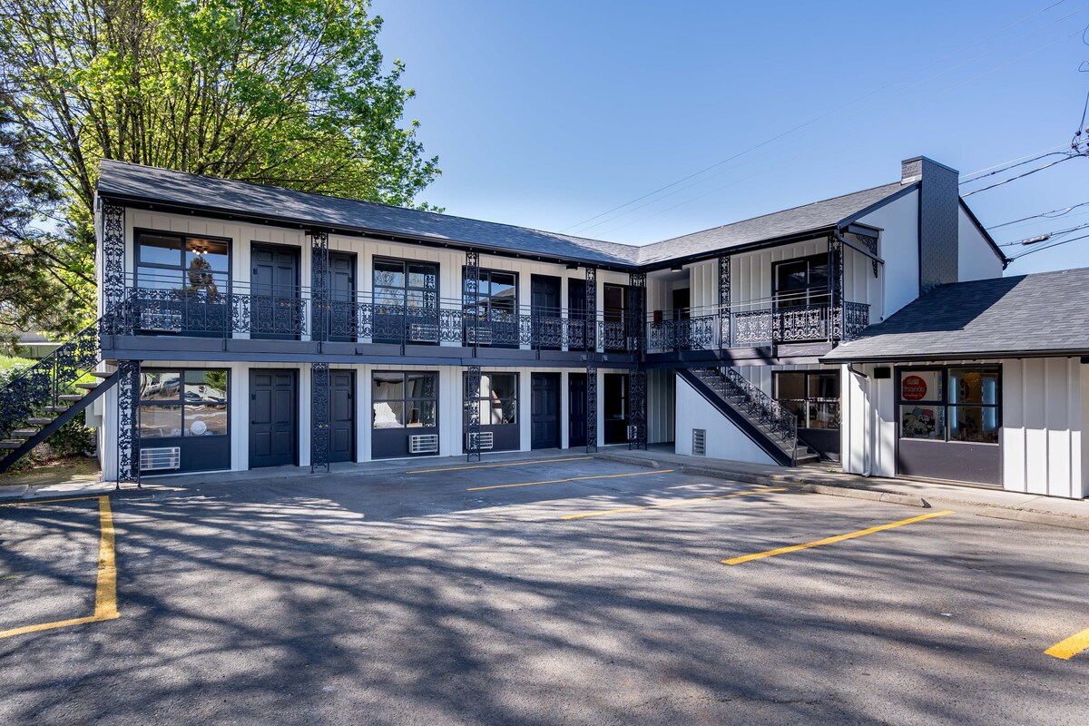 Boutique motel li għadu kif ġie rranġat bi stil u faxxinu! Tant qrib l-affarijiet tajbin u l-iktar postijiet popolari tal-post fejn jinsab il-listing. Passi minn ikel tajjeb, nightlife, xiri u minuti sa Hayward + University ta' Oregon. Jinkludi parkeġġ bla ħlas, Wi-fi, streaming HD, friġġ żgħir w/friża, microwave, stazzjon tal-kafè, kumditajiet tal-banju ta' kwalità għolja u disinn maħsub. Checkin u ħruġ mingħajr ċavetta u mingħajr kuntatt! Aċċess faċli għall-mogħdija mingħajr ħlas u ċ-ċentru ta' Eugene. Inti se tkun dritt fin-nofs ta 'dan kollu. Proprjetà, iddisinjata u mmexxija minn resident lokali.
