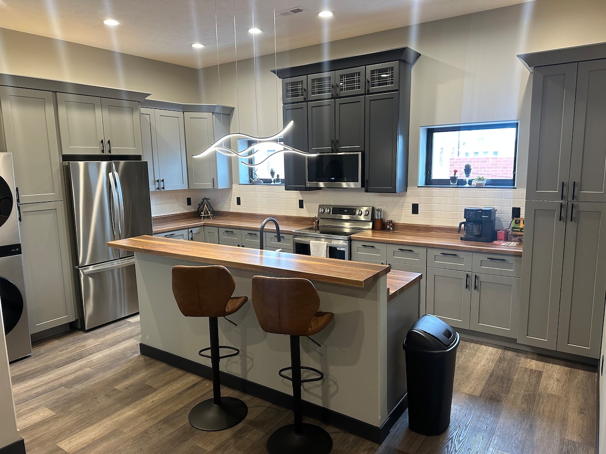 Peaceful, fun, open, intentionally designed 3 bedroom oasis in central Kearney, Nebraska. 🏡 King suite, Queen bedroom, Full over Full "Bunkhouse", Futon, 2 couches, twin floor bed & Queen Air Mattress Roku TVs & extra blankets in every room PS4 Foosball 🤙 Boho Hanging Egg Chairs Dining table seats 8 Coffee bar ☕️ Butcher block Full fridge & freezer Washer & Dryer Tons of games Privacy fenced yard w/ large deck, dining table, fire table, grill, & hammocks! Play & relax 🪴🏡🪴