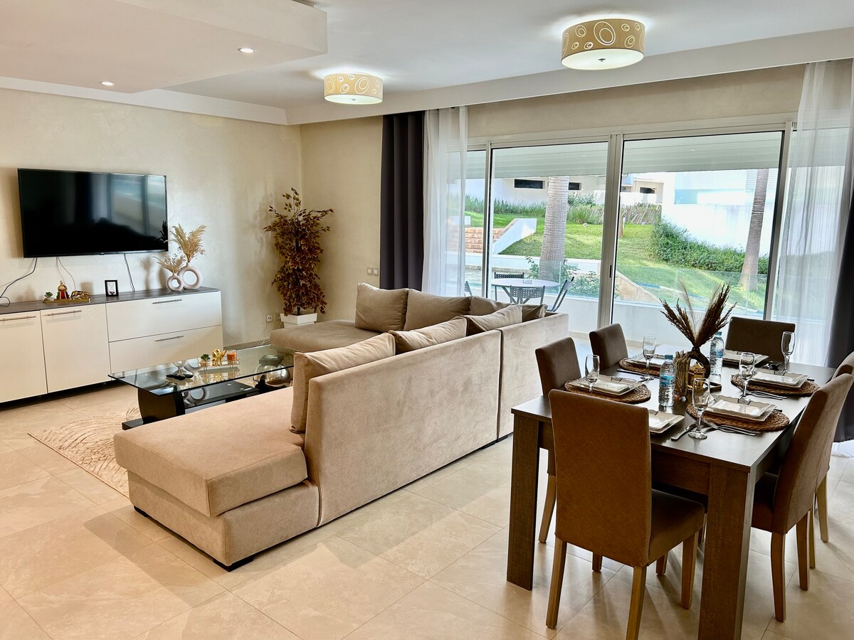 Appartament spazjuż bi 3 ikmamar tas-sodda b' hot tub u salott privat kbir b' arja kkundizzjonata fuq terrazzin mgħotti. Gawdi mument ta' rilassament f' privatezza sħiħa. 7 minuti 'l bogħod minn Malabata bil-karozza, qrib il-bajja, l-istazzjon tal-ferrovija TGV, ir-ristoranti u ċ-ċentru. Ideali għall-familji jew għall-gruppi: Fiber Wi-Fi, Netflix, kċina mgħammra, 3 kmamar tas-sodda komdi u dak kollu li għandek bżonn biex tħossok qisek qiegħed id-dar ġewwa Tangier.