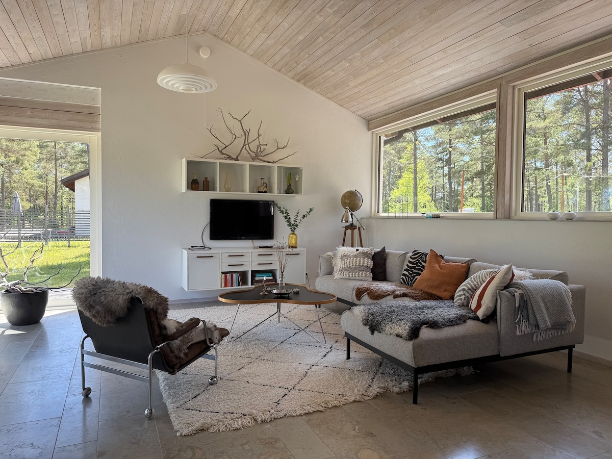 Merħba għall 110 sqm tagħna dar ħolma mfassla mill-arkitett. Id-dar hija mqassma fi tliet kmamar tas-sodda, oranġjo, kamra tal-banju, kċina, kamra tal-ikel u kamra tas-salott fil-parroċċa. Mill-loft toħroġ ukoll fuq it-terrazzin tas-saqaf li għandu veduta wiesgħa tal-Baħar Baltiku. L-oranġerija bil-ħġieġ hija r-rabta bejn il-kamra tas-salott u ż-żona tal-kamra tas-sodda. Hawnhekk tista 'toqgħod bilqiegħda tara l-istilel jew tixgħel in-nar fil-fireplace. Il-kamra tal-banju għandha banju tal-ġebel franka fondut. Bungenäs hija żona unika mingħajr karozzi, parkeġġ 800 m' il bogħod mid-dar.