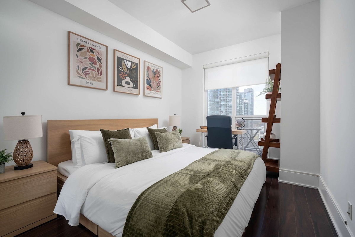 Merħba f' kamra tas-sodda waħda eleganti tiegħek, appartament wieħed fil-kamra tal-banju b' post wieħed għall-parkeġġ bla ħlas u 10 minuti mixi 'l bogħod mit-Torri CN, u eżatt fil-qalba ta' Toronto! Gawdi mill-gym u s-sawna kollha fuq ġewwa u l-jacuzzi ta' barra. Fitness GoodLife, LCBO u Scotiabank Theatre huwa biss 5 minuti bil-mixi! Kafetteriji, ristoranti u divertiment madwar iż-żona. L-unità tinkludi Wi-Fi veloċi, Netflix, kċina sħiħa u ħasil tal-ħwejjeġ ġewwa s-suite - ideali għall-vjaġġi tax-xogħol, għall-vaganzi għal tmiem il-ġimgħa jew għaż-żjarat fit-tul.