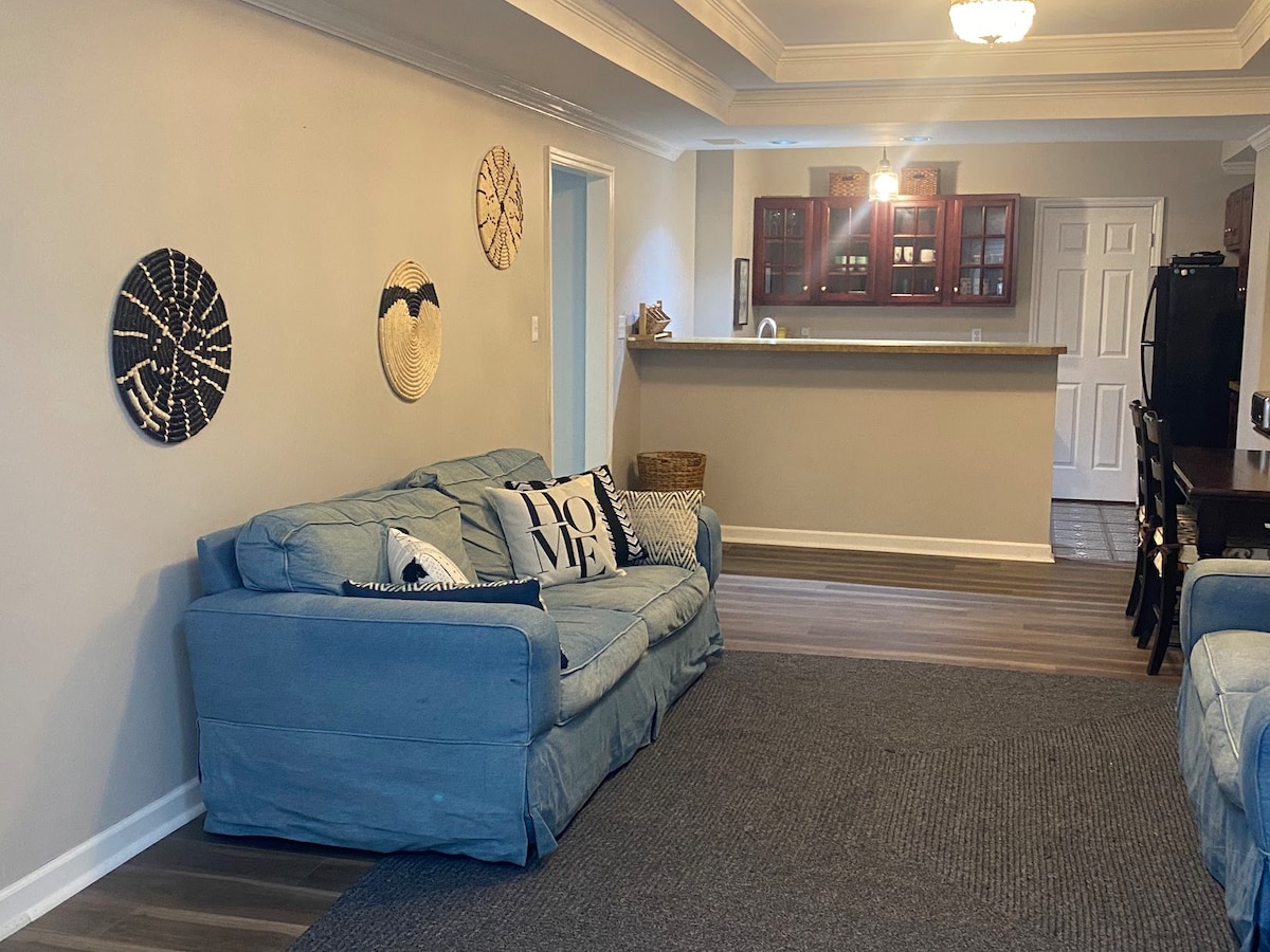 Suite tal-klijenti spazjuża f' viċinat sabiħ ta' Buford b' daħla privata u terrazzin. Għandha kamra tas-sodda kbira b' sodda king-size u ħażna wiesgħa, 2 kmamar tal-banju u kċina mimlija għodod, ħwawar, platti, borom u taġnijiet. Gawdi s-salott kbir b' żona tal-ikel, smart TV u Wi‑Fi veloċi. Ideali għall-vjaġġaturi għax-xogħol jew għall-koppji. 10 minuti biss sa Mall ta' Georgia, 15–20 minuta sa Lake Lanier u mixja qasira sa Four Oaks Manor. Parks, xiri u kafetteriji lokali fil-qrib.