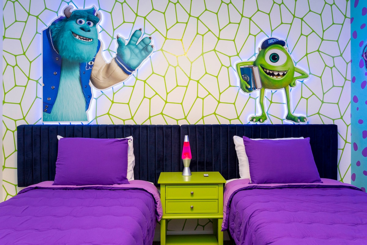 "Ftit mili 'l bogħod minn Disney sa 16-il klijent! Irrilassa fil-pixxina u fil-jacuzzi. Ċinema privata avvanzata, bi skrin ta' 150 pulzier, proġekter 4K u ħoss immersiv tal-madwar. Erġa' għix il-mumenti tal-films favoriti tiegħek bħal qatt qabel! Stream on Roku, logħba fuq PS5, u gawdi Wi-Fi b' veloċità għolja għal divertiment bla tmiem. Il-kċina mgħammra sew hija perfetta għall-familji kbar u b' 6 ikmamar tas-sodda u 4 ikmamar tal-banju en-suite, il-privatezza hija garantita. Star Wars u kmamar b' tema ta' Disney biex it-tfal iħossuhom komdi.